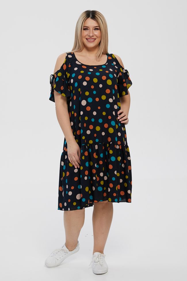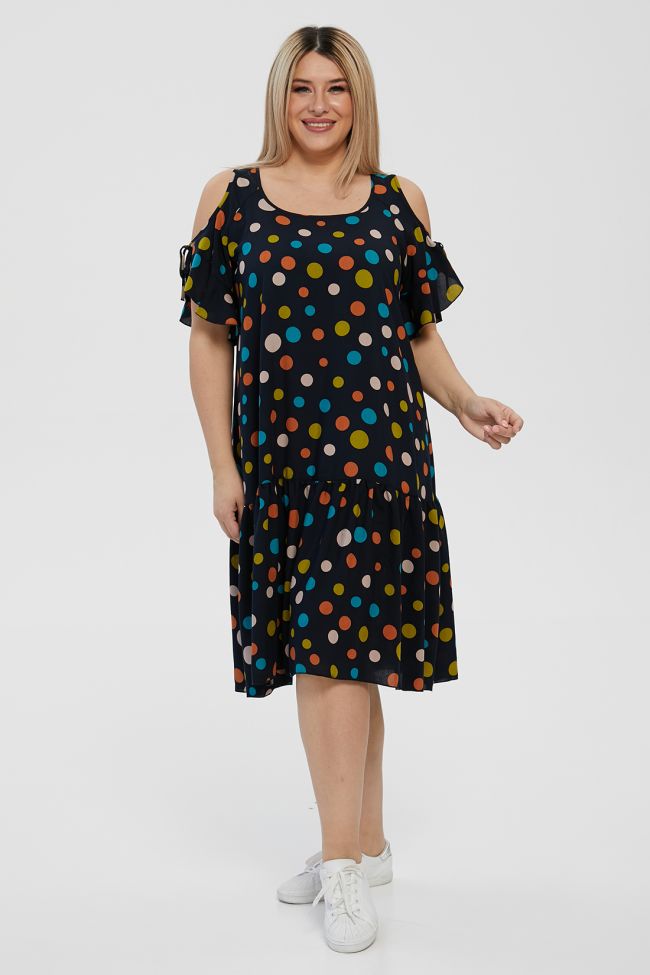 сине-белый Летний сарафан свободного силуэта длиной до линии колен. Выполнен из штапельной ткани с  принтом "цветные горохи". Вырез горловины обработан окантовкой. Рукава-реглан с фигурным вырезом и воланом по низу, переходящим в завязки. Низ изделия с широкой притачной оборкой. Модель прекрасно подходит модницам с любыми формами. Отличный выбор для создания комфортного летнего образа.