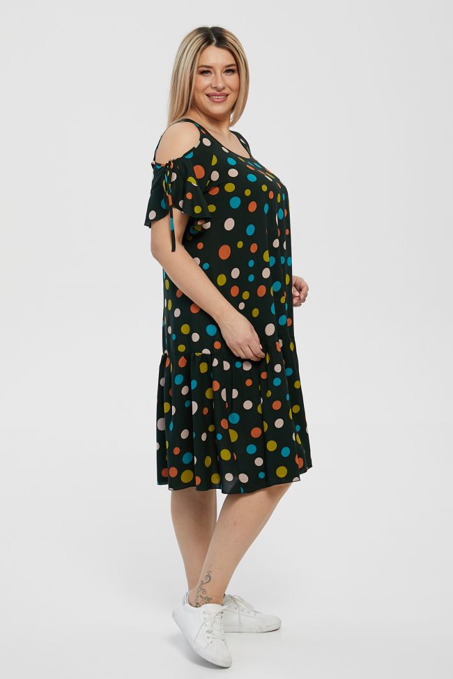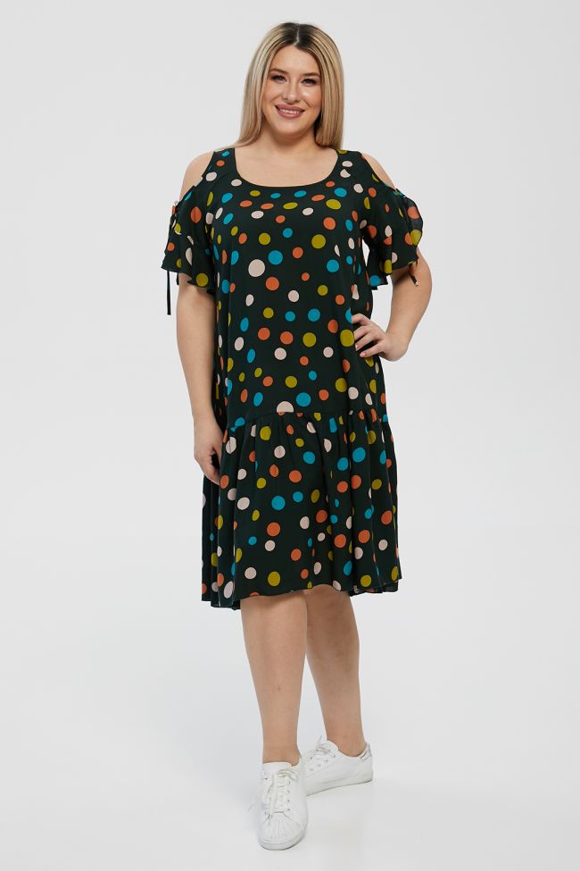 темно-зеленый Летний сарафан свободного силуэта длиной до линии колен. Выполнен из штапельной ткани с  принтом "цветные горохи". Вырез горловины обработан окантовкой. Рукава-реглан с фигурным вырезом и воланом по низу, переходящим в завязки. Низ изделия с широкой притачной оборкой. Модель прекрасно подходит модницам с любыми формами. Отличный выбор для создания комфортного летнего образа.