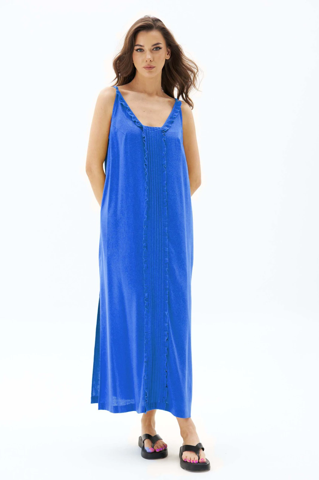 Самый классический и самый любимый вариант летнего сарафана - сарафан прямого кроя. Он не теряет своей популярности, ведь с ним очень легко создавать модные образы. Лаконичность и изысканность - вот главная идея нашего сарафана.Полочка со сложным вырезом, нагрудной вытачкой, отрезной центральной частью с защипами и кокетливой рюшей.Спинка со средним швом. По боковым швам карманы и эффектные разрезы.Бретель тонкая, регулирующаяся.Длина сарафана около 132 см.
