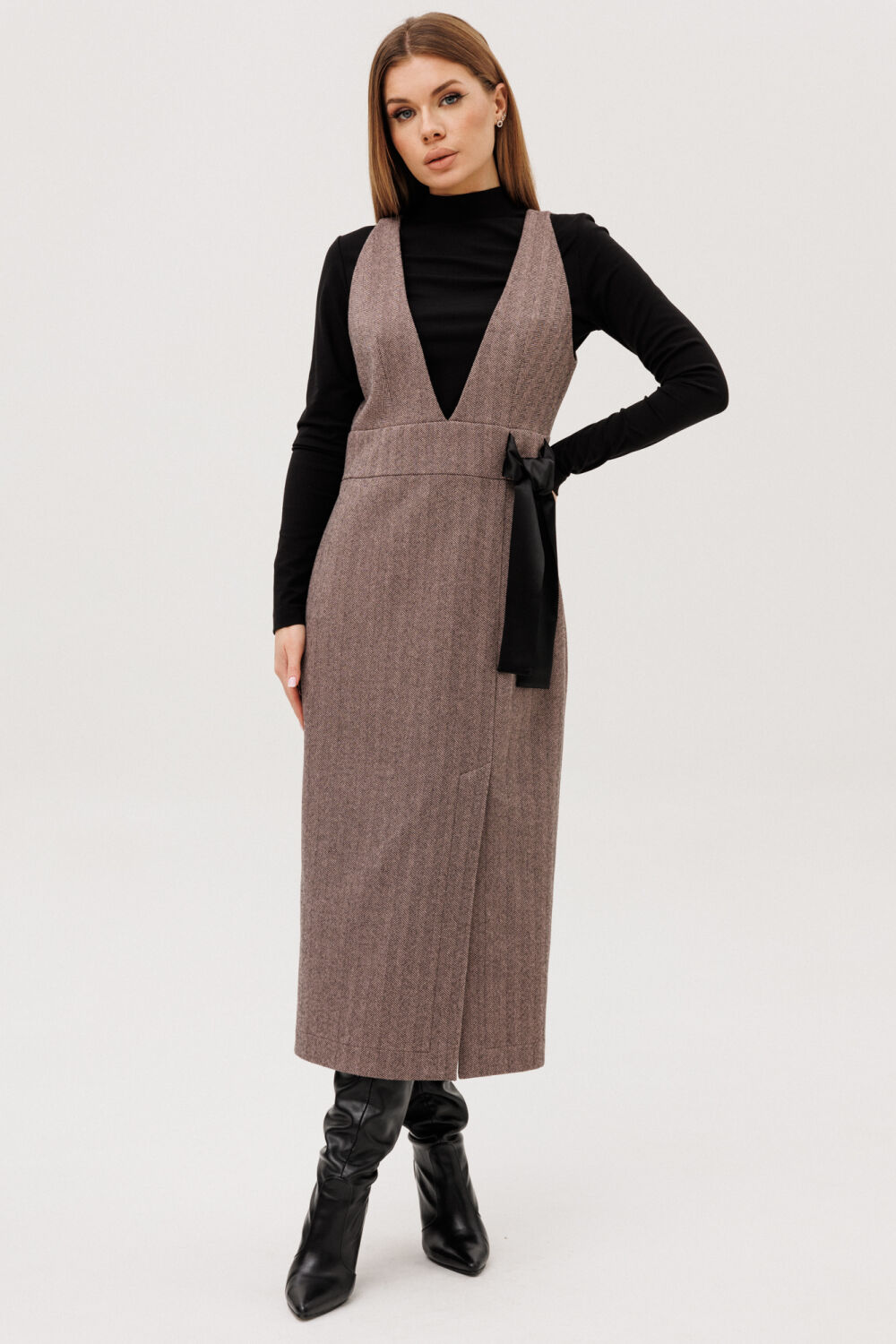 Сарафан женский прилегающегосилуэта с V-образным вырезом, вытачками на лифе. На притачном поясе декоративный элемент (БАНТ) ИЗ АТЛАСНОЙ ЧЕРНОЙ ТКАНИ. По переду разрез. На спинке сарафана молния. Длина миди. Изделие на подкладке