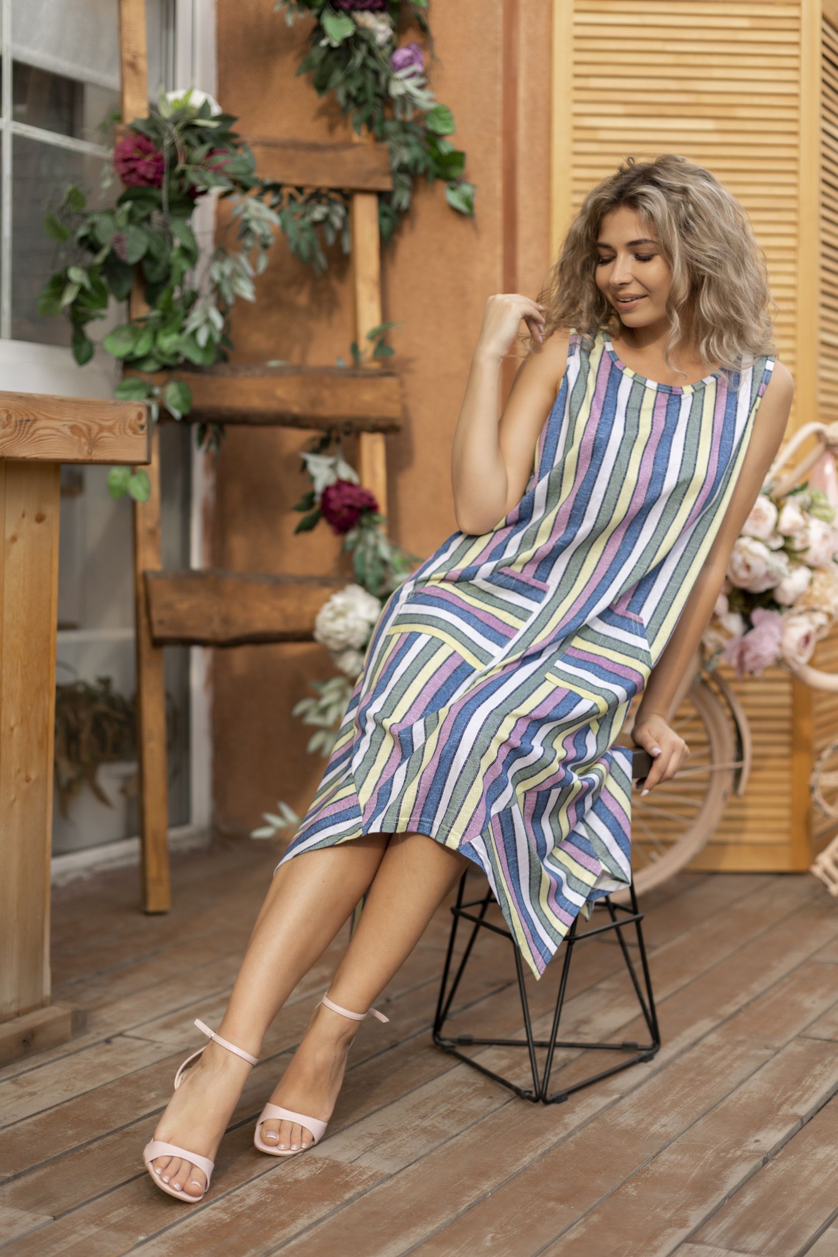Сарафан женский летний на широких бретелях – это легкое и удобное летнее платье  без рукавов. Женский сарафан свободного кроя изготовлен из натурального хлопкового материала, что делает его дышащим и приятным для тела. Он идеально подходит для жаркой погоды, комфортен в повседневной носке и придает образу легкости и непринужденности. Такой наряд прекрасно дополнит летний гардероб и подчеркнет вашу женственность.  Сарафан женский больших размеров отлично подойдет для дома, для отдыха и прогулок, для пикников и пляжного отдыха. Благодаря простоте и универсальности дизайна, этот сарафан может стать идеальным выбором для отпуска или путешествий, когда вам нужна легкая и практичная одежда.