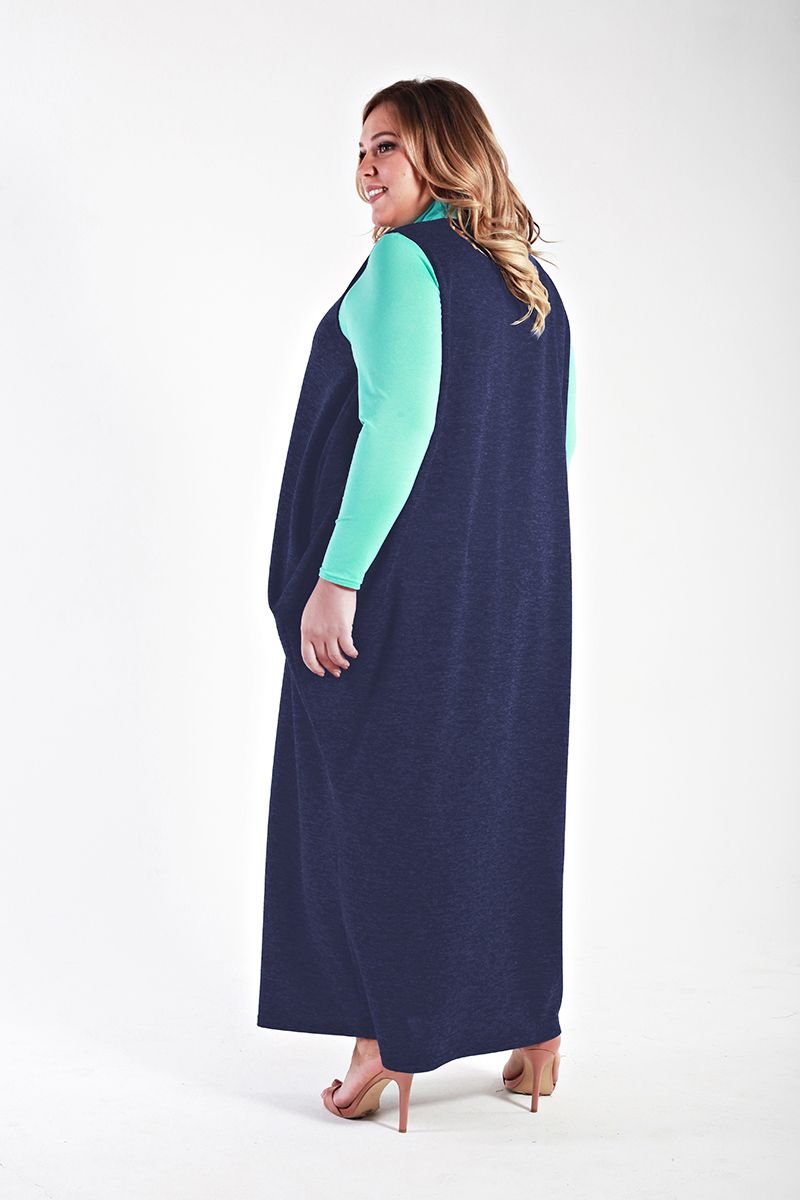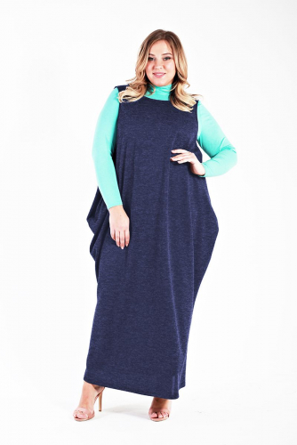 Темно-синий Стильный необычный сарафан-баллон из джерси-меланжа. Чуть ниже бедер расположены красиво драпирующиеся складки, которые выгодно "маскируют" нежелательные объемы. В боковых швах - карманы.