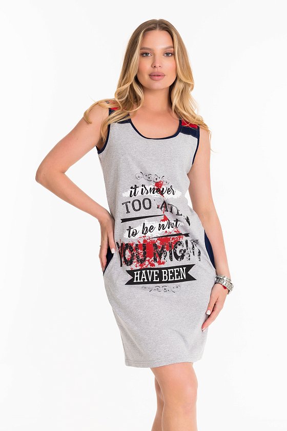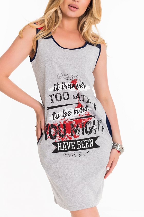 Сарафан на широких бретелях выполнен из хлопкового полотна. Спереди нанесён принт. По бокам размещены карманы.