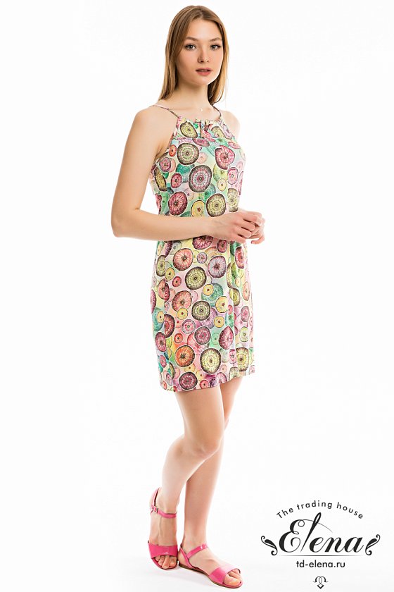 Сарафан выполнен из вискозного полотна с набивным рисунком. Длину бретелей можно регулировать при помощи завязки.
