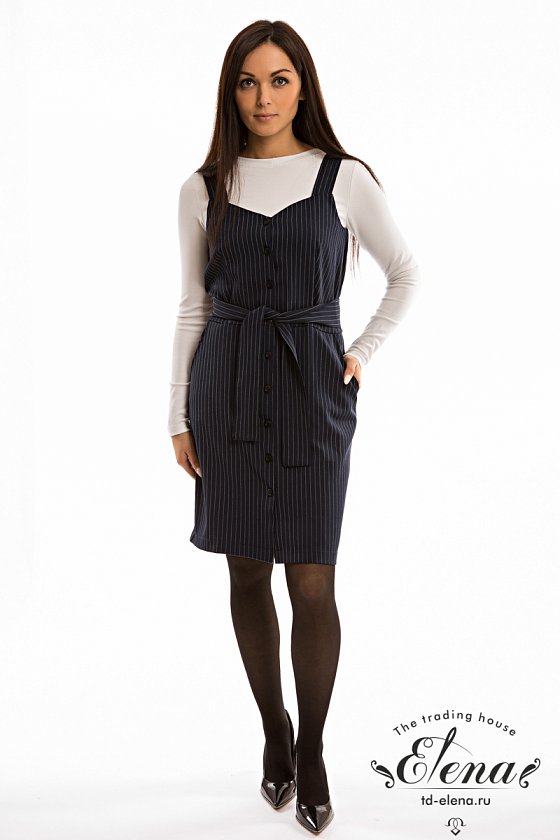 Женский сарафан на бретелях выполнен из ткани "джинса" в мелкую вертикальную полоску. Спереди сарафан застёгивается на пуговицы, линию талии подчёркивает пояс.