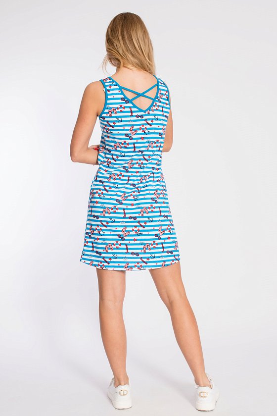 Сарафан выполнен из кулирки с набивным рисунком. Вырез горловины V-образный, сзади с перекрещивающимися бретелями.