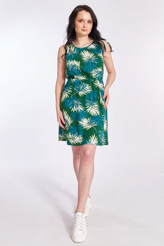 Сарафан на бретельках выполнен из х/б полотна с набивным рисунком. На резинке по талии и с карманами по бокам.