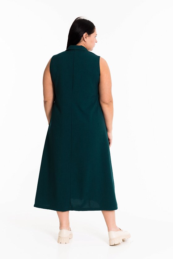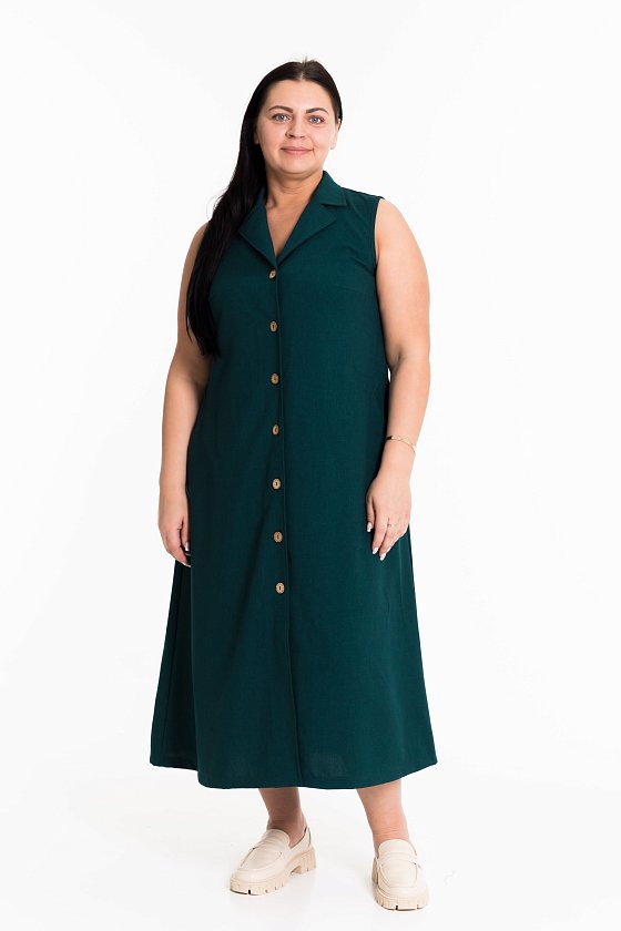Сарафан выполнен из однотонного искусственного льна. Сарафан длиной миди спереди застегивается на пуговицы, воротник отложной. В боковых швах размещены карманы.