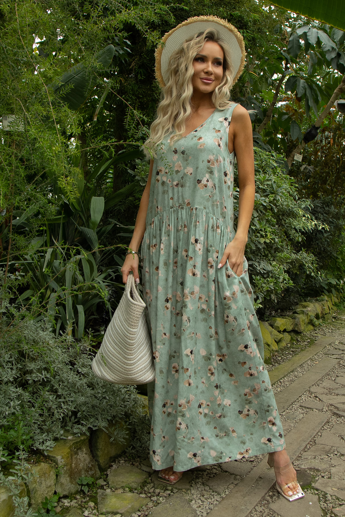 Платье свободного силуэта без рукавов идеально для теплых дней. Легкое и натуральное, оно гармонично сочетается как с каблуками, так и с кедами. Удобные боковые карманы позволяют носить с собой мелочи. Юбка собрана в драпировку, что даёт свободу в бёдрах и движении. Завершает образ V-образный вырез горловины.