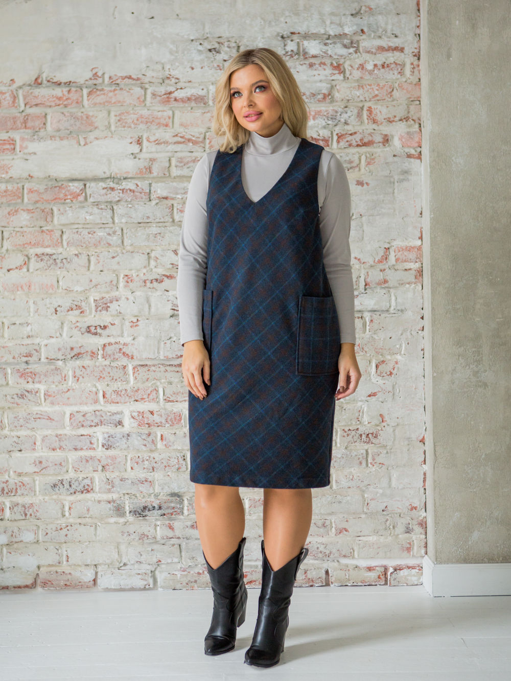 Теплый повседневный сарафан силуэта «Бочонок», выполнен из плотного эластичного шерстяного полотна. Перед и спинка целые. По переду два больших накладных кармана. V-образный вырез горловины переда, горловина спинки и глубокая пройма сарафана обработаны обтачками. По швам обтачивания отделочные строчки. Сарафан с подкладом без застежек. Длина изделия по спинке в 50 р-ре –  100 см. в 64 р-ре – 107 см.