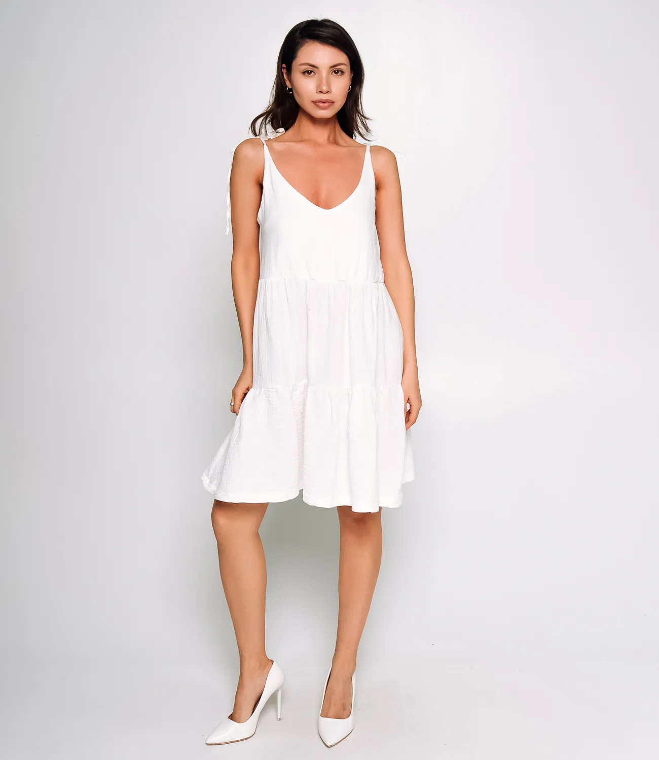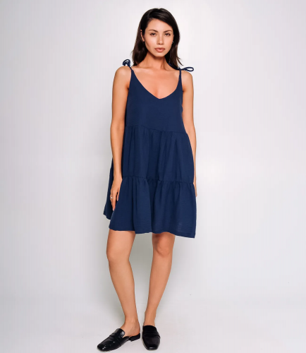 Этот сарафан выполнен из легкой ткани. Сарафан выполнен из легкой, мягкой ткани с небольшой фактурой. Модель свободного кроя, не прилегает к телу, создавая комфорт и простор. Верхняя часть сарафана имеет глубокий V-образный вырез и тонкие регулируемые бретели, которые завязываются на плечах в небольшие бантики. Длина изделия заканчивается выше колен, что делает его удобным и стильным вариантом для теплой погоды. Общий силуэт расслабленный и воздушный, подходящий для повседневной носки. Использованный для пошива материал - 95% полиэстера, 5% спандекса- обеспечивает легкость и воздухопроницаемость, что делает сапафан прекрасным выбором на теплую погоду.