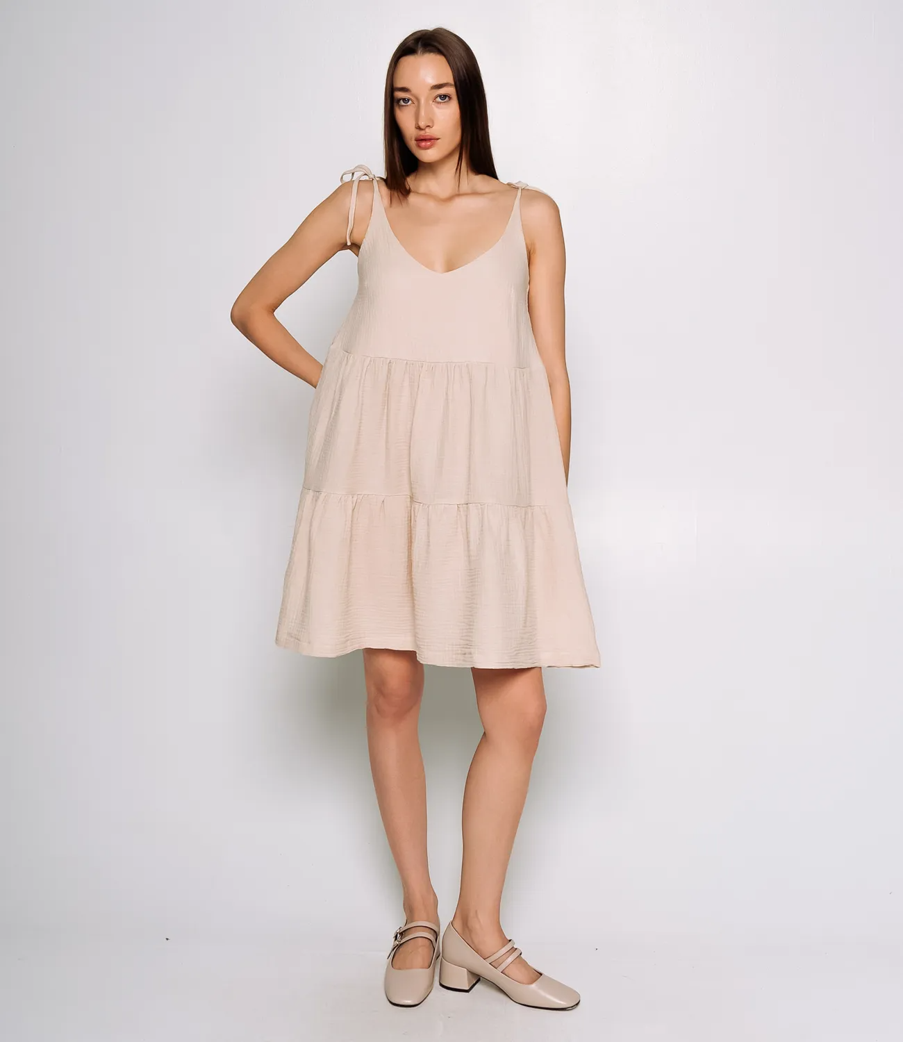 Этот сарафан выполнен из легкой ткани. Сарафан выполнен из легкой, мягкой ткани с небольшой фактурой. Модель свободного кроя, не прилегает к телу, создавая комфорт и простор. Верхняя часть сарафана имеет глубокий V-образный вырез и тонкие регулируемые бретели, которые завязываются на плечах в небольшие бантики. Длина изделия заканчивается выше колен, что делает его удобным и стильным вариантом для теплой погоды. Общий силуэт расслабленный и воздушный, подходящий для повседневной носки. Использованный для пошива материал - 95% полиэстера, 5% спандекса- обеспечивает легкость и воздухопроницаемость, что делает сапафан прекрасным выбором на теплую погоду.