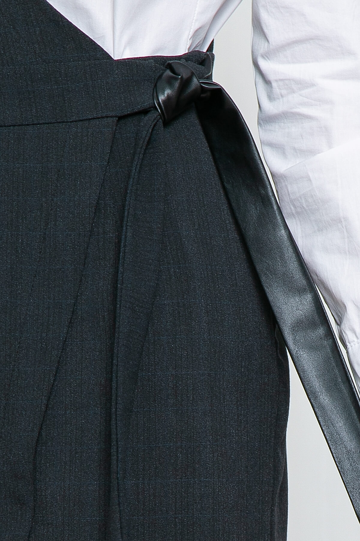 Сарафан с ассиметричным верхом в классическом стиле идеально разнообразит Ваш офисный образ. Сарафан скроен на запах. Отлично смотрится с базовой рубашкой. При необходимости можно добавить аксессуаров, это придаст образу привлекательности. В боковом шве есть потайная молния.