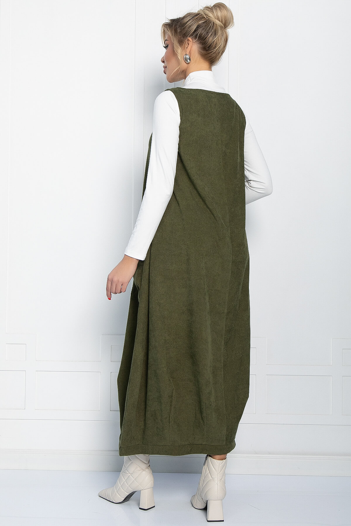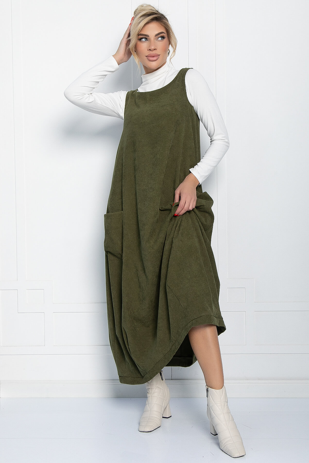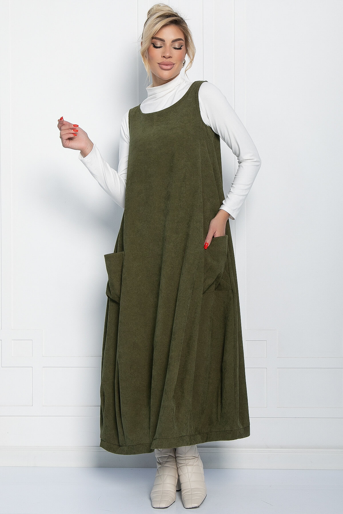 Стильный женский сарафан бохо из красивого вельвета в оттенке хаки. Форма длинного сарафана нестандартная: объёмный вверх и зауженный к низу. У сарафана заниженные объёмные накладные карманы и широкие бретели. В нашем платье-сарафане вы не останетесь незамеченной! Такая женская одежда прекрасно сочетается как со строгой рубашкой так и с обычной водолазкой!