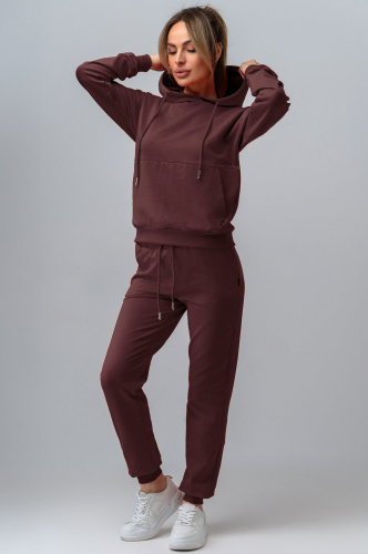В наборе однотонные худи и брюки с карманами. Толстовка дополнена манжетами, мягко обхватывающими запястья, карманом-кенгуру и капюшоном, регулируемым с помощью шнурка. Штаны подчеркнут изящность бёдер и сделают талию визуально тоньше. Джоггеры имеют эластичный пояс со шнурком и манжеты внизу для хорошей фиксации.