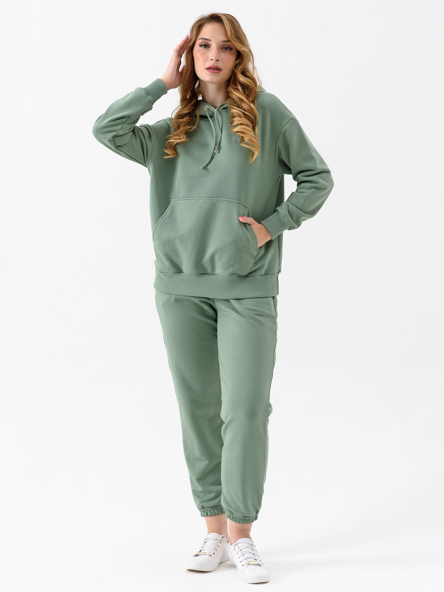 Костюм женский спортивного стиля из петельчатого полотна «футер» 3-х нитка , состоящий из толстовки и джоггеров. Толстовка свободной формы со спущенным втачным рукавом; капюшоном и вышивкой на полочке, манжетами по рукавам и низу из трикотажного полотна «кашкорсе». На капюшоне люверсы и шнур, для регулировки объёма по горловине. Капюшон на подкладке из х/б трикотажного полотна-«кулирка». Джоггеры свободной формы, с боковыми карманами, отрезным поясом на резинке. По поясу брюк кулиса, позволяющая регулировать объём изделия. Низ брюк собран на резинку. Костюм отлично подойдёт для занятий спортом и вечерних прогулок.
