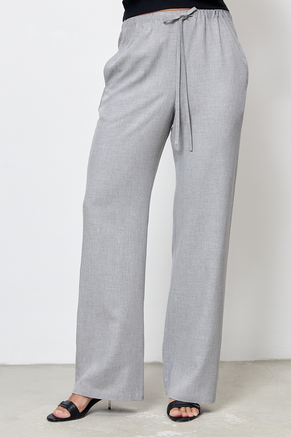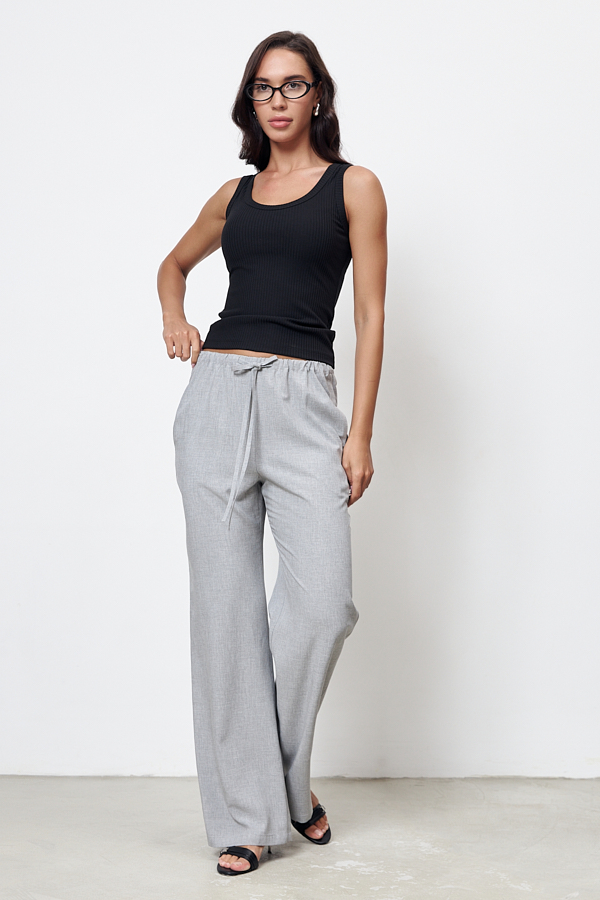 Брюки из вискозной ткани прямого силуэта. Пояс с эластичной резиной и кулиской, в боковых швах карманы.