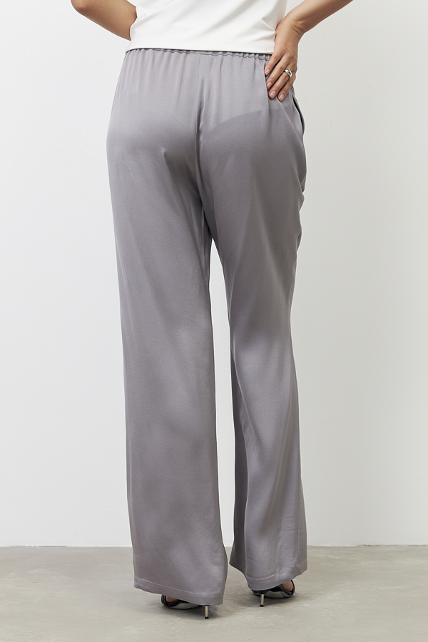Брюки прямого силуэта из вискозной ткани с сатиновым блеском. Пояс притачной с эластичной резиной, в боковых швах карманы.