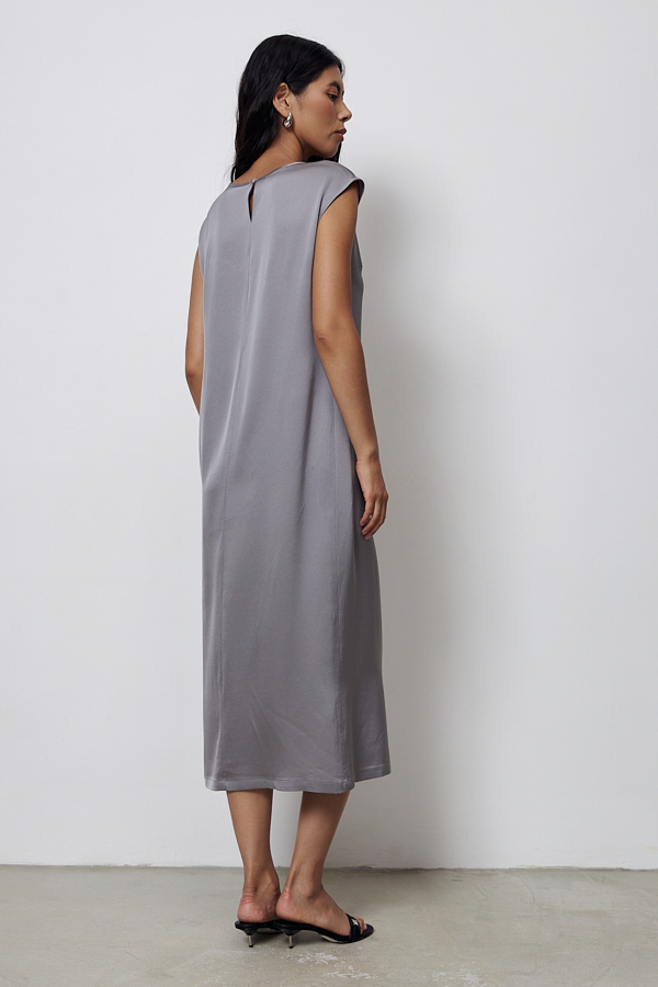 Платье из вискозной ткани с сатиновым блеском. Полуприлегающий силуэт, с разрезом в боковом шве. По среднему шву спинки застёжка на петлю-пуговицу. Круглый вырез горловины и линия проймы окантованы косыми бейками из основной ткани.