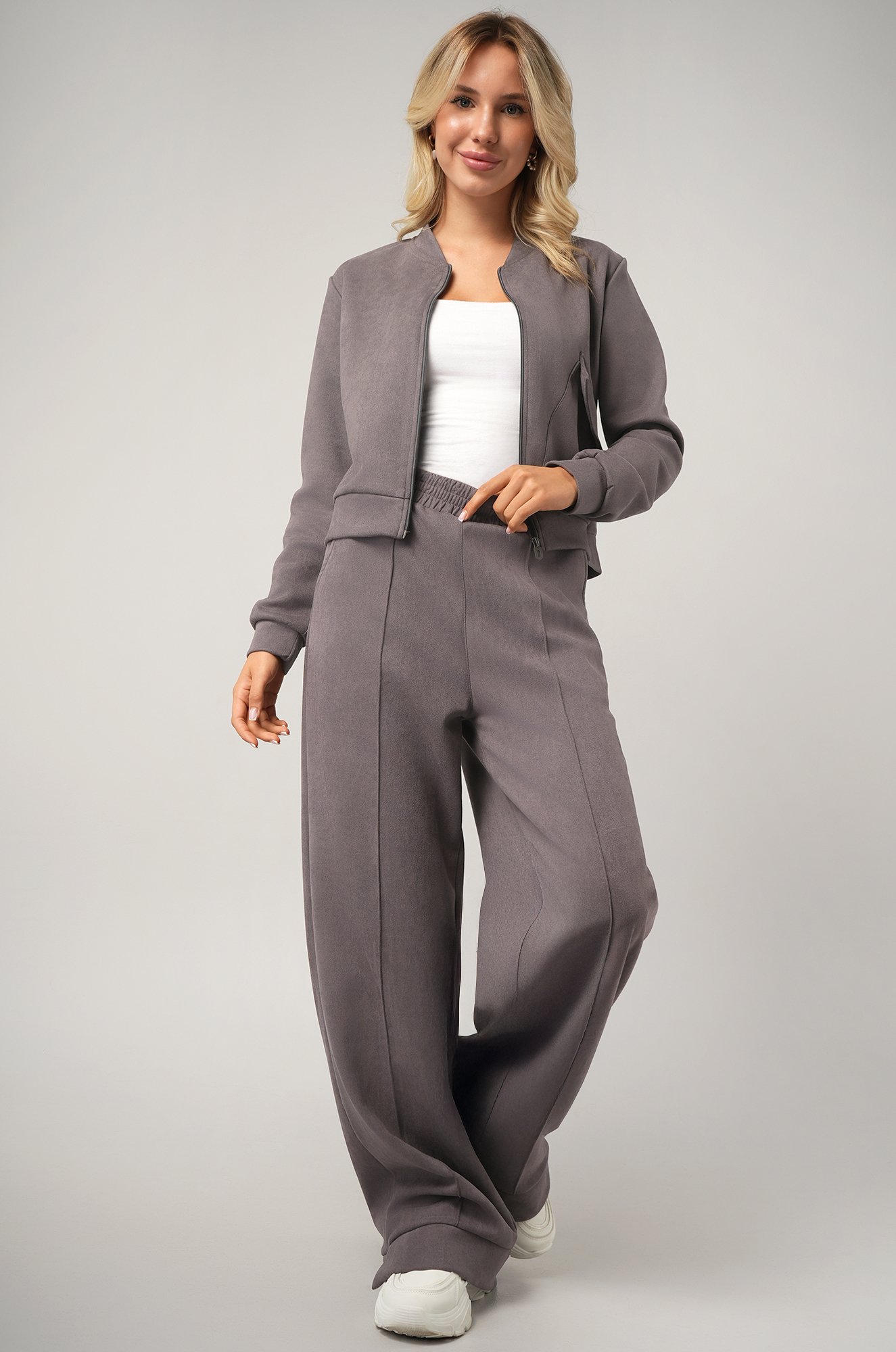 Ты – часть городской эстетики! Серый б..показатьрючный костюм выполнен из экозамши ― плотного и мягкого материала. Замшевый костюм с толстовкой имеет удобную застежку на молнию и акцентный карман. Костюм с брюками идеален на эту осень.