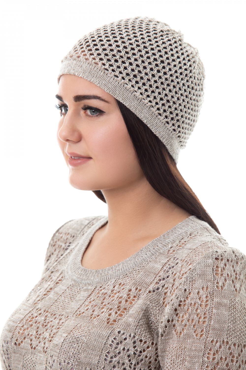 Шапочка лен 100%, ажур сетка, по краю чулок.