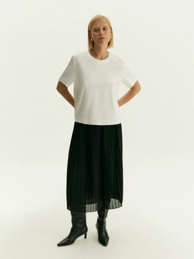 Плиссированная юбка цвета из чёрного шифона внесёт в образ немного романтики. Выполнена на подкладке. Модель А-силуэта имеет высокую посадку. Застёгивается на потайную молнию на спинке. С юбкой сочетается любой однотонный верх: классические рубашки и блузки, трикотажные футболки и атласные топы