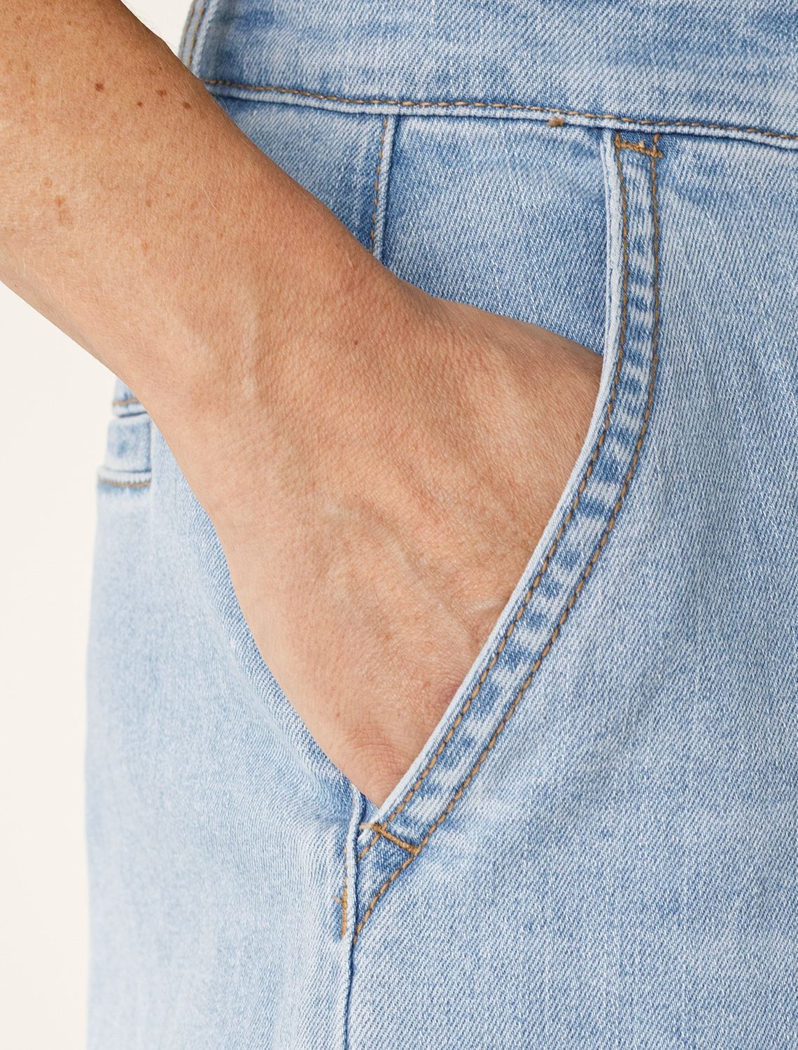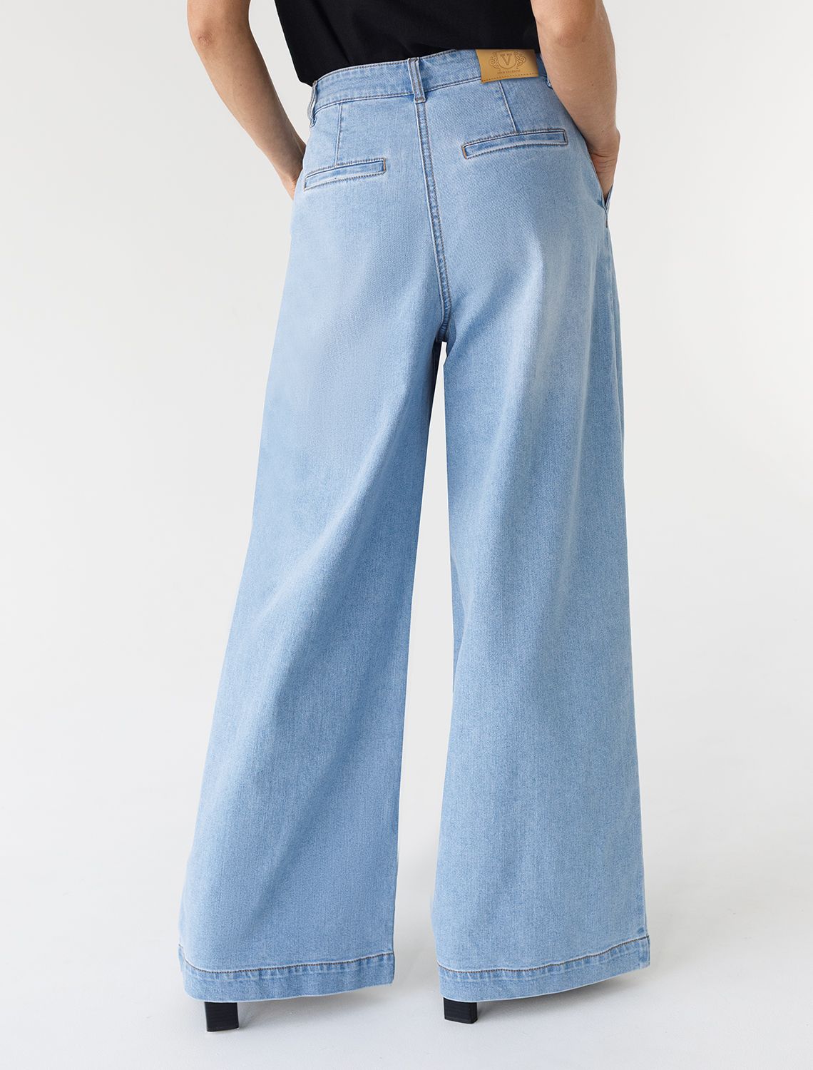 Свободные широкие джинсы голубого цвета с защипами из эластичного денима созданы для тех, кто ценит комфорт и стиль в повседневной жизни. Модель отличается свободным кроем, который обеспечивает удобство движений и гармонично подчеркивает современный силуэт. Защипы добавляют изюминку и делают образ более интересным, а также визуально вытягивают силуэт. Благодаря использованию эластана материал сохраняет свою форму даже после длительной носки и многочисленных стирок.