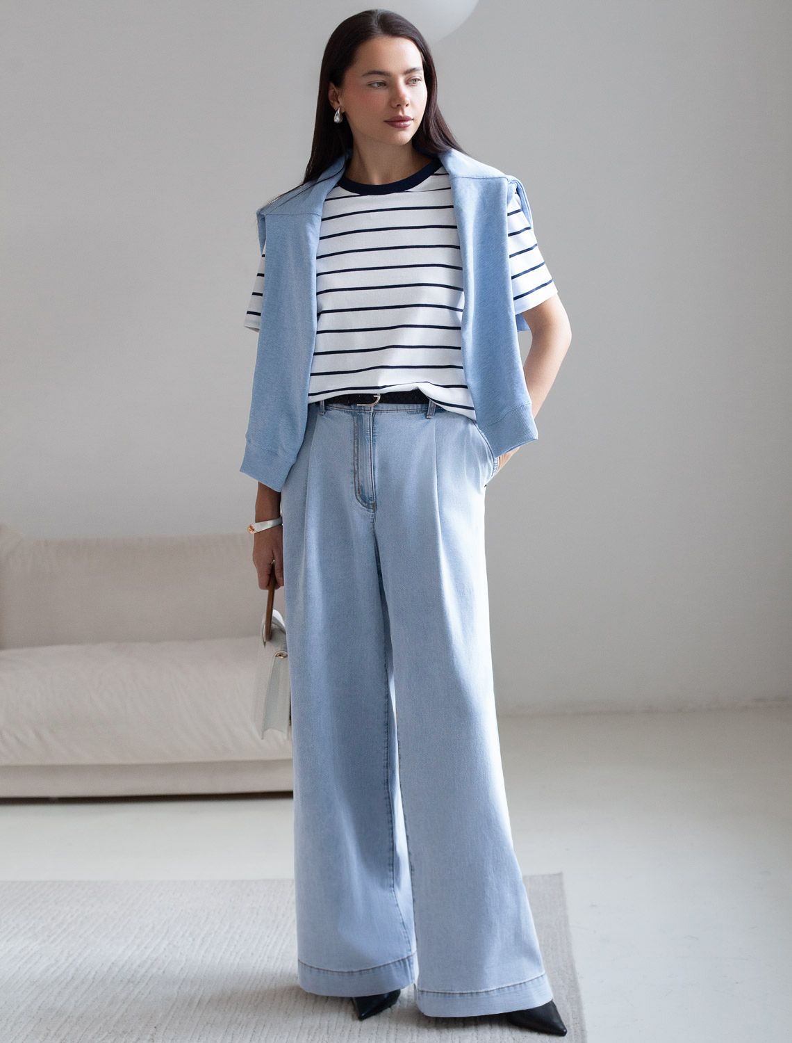 Широкие джинсы белого цвета выполенены из облегченного денима плотностью 8 OZ, они идеально подходят для весны и лета. После пошива изделие подвергли специальному виду вошинга — salt-stone washing (солт-стоун вошинг), что дословно значит стирка с каменной солью. Такой вид вошинга позволяет получить стильные потертости на голубых оттенках денима. Модель дополнена защипами на поясе, которые формируют актуальный свободный крой. Джинсы палаццо идеально подойдут для девушек и женщин размера plus size (плюс сайз) с широкими бедрами и скроют недостатки, Высокая талия с защипами визуально корректирует фигуру и вытягивает силуэт. Качественная надежная фурнитура делает добавлет образу премиальности. Широкие легкие джинсы не стесняют движений, позволяя чувствовать себя комфортно даже в жаркую погоду. Джинсы палаццо — идеальный баланс между расслабленным стилем и элегантностью, вариант для тех, кто ищет достойную альтернативу классике на каждый день.