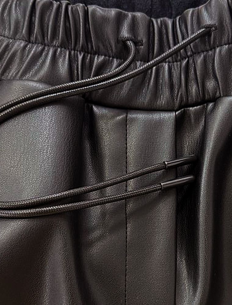 Трендовая модель для смелы модных образов. Эти брюки из качественной искусственной кожи создают бунтарский урбанистический лук. Модель с высокой посадкой на поясе и равномерно широким клешёным силуэтом от бедра до низа визуально вытягивает фигуру. Мягкая подкладка пояса обеспечивает комфорт, не сдавливая талию. Универсальный черный цвет легко комбинируется с объемными худи, кроп-топами или лаконичными рубашками. Идеальны для создания образов в стиле гранж.