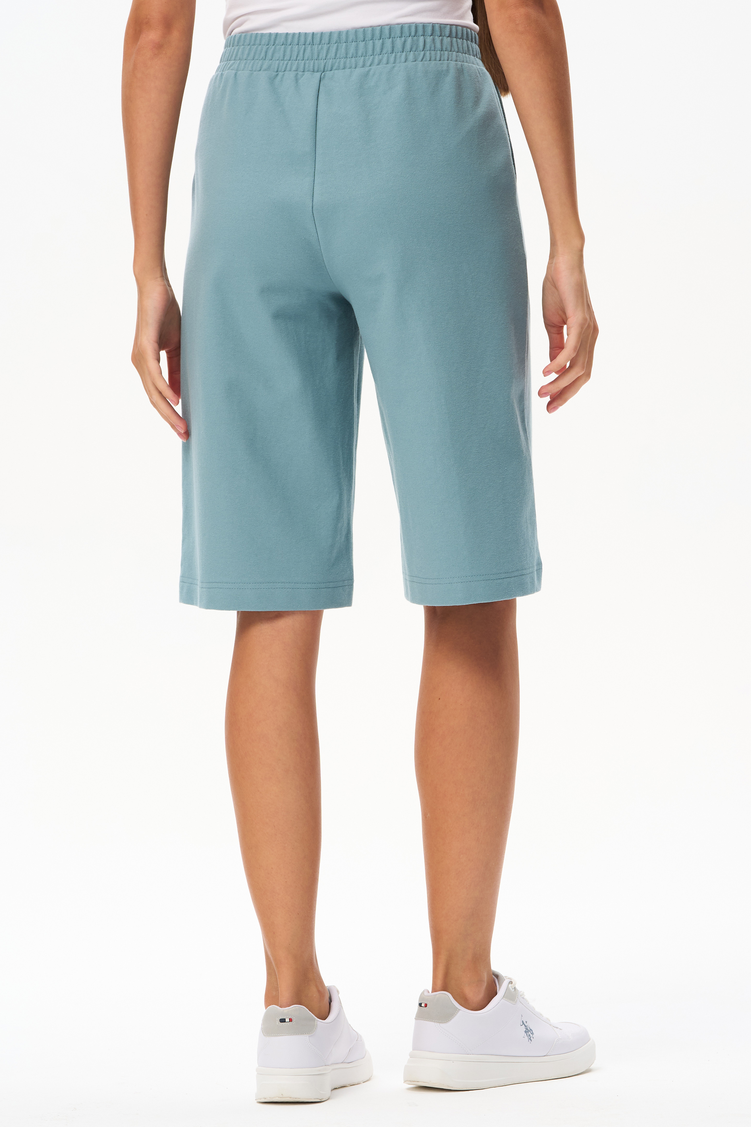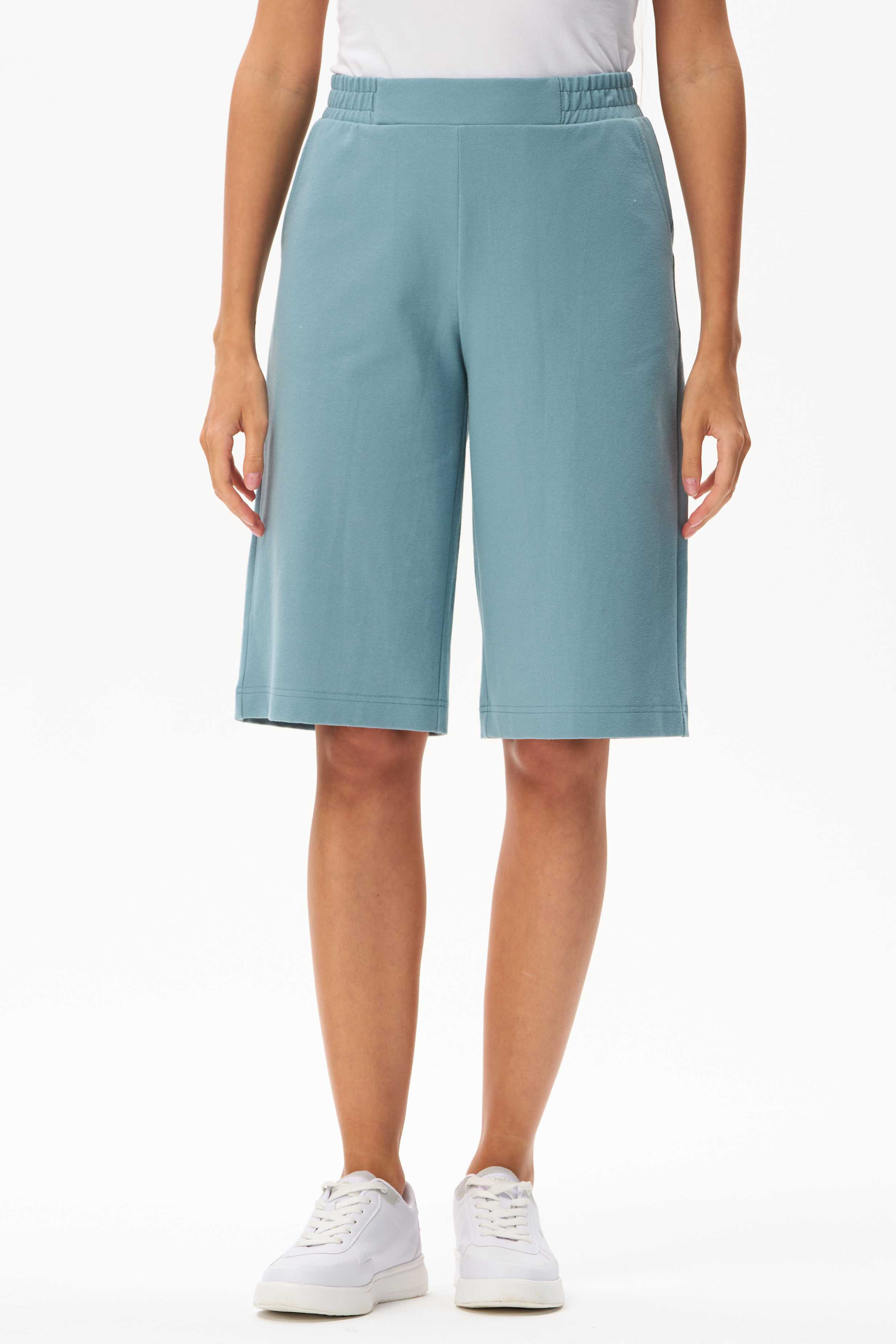 Шорты длиной до колен из хлопковой трикотажной джинсы 240 гр в трендовом оттенке Голубой дельфиниум. Модель с классическими карманами, пояс с планкой и эластичной лентой внутри. Комфортная, универсальная модель для городских образов, отдыха и путешествий. Рост модели 175 см.