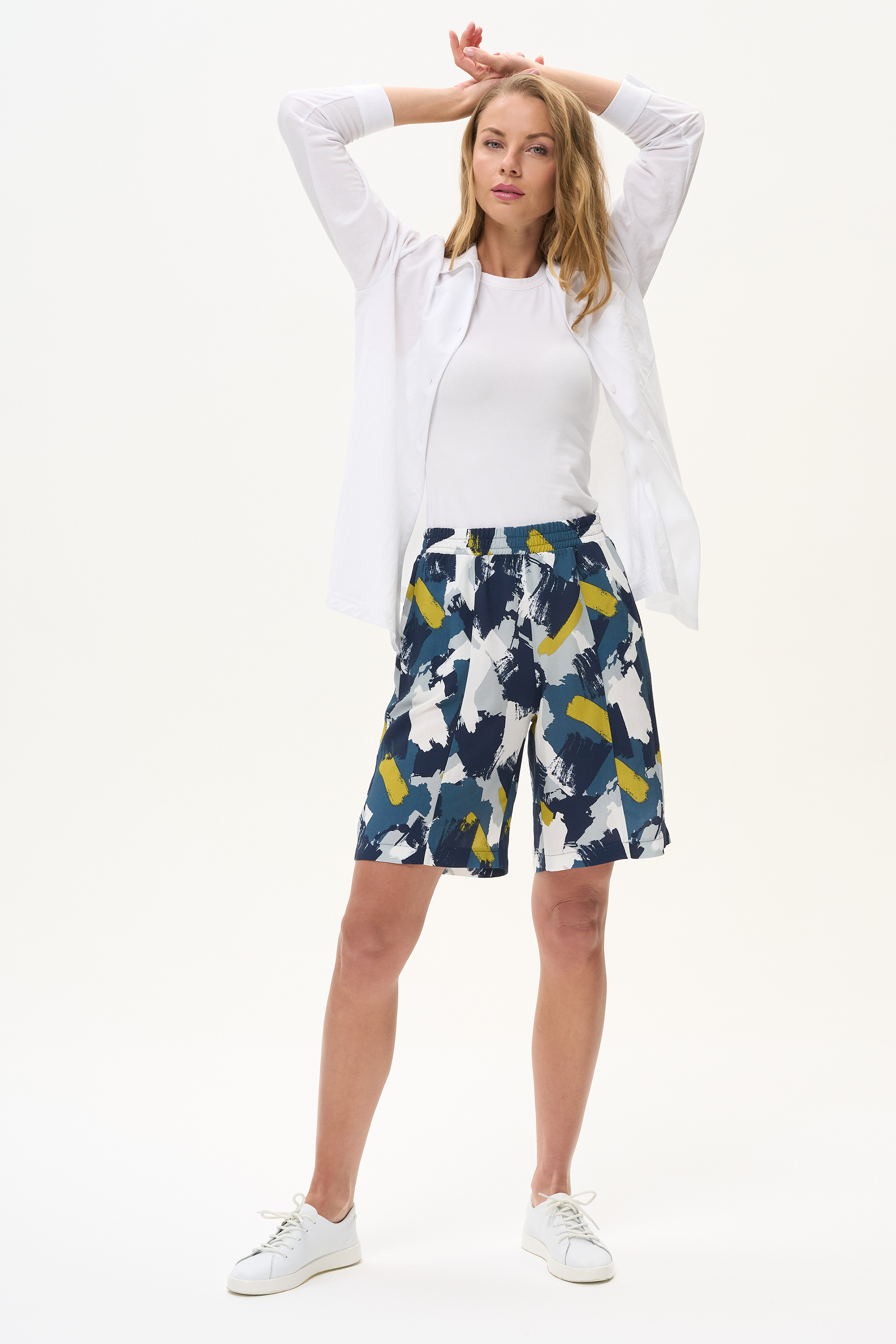 100% вискоза Лёгкие шорты из штапеля 120 гр рисунок Яркая абстракция. Модель свободная, длиной до колен, пояс с эластичной лентой внутри. Стильные свободные летние шорты -отличный вариант для города, отдыха и прогулок. Рост модели 175 см.