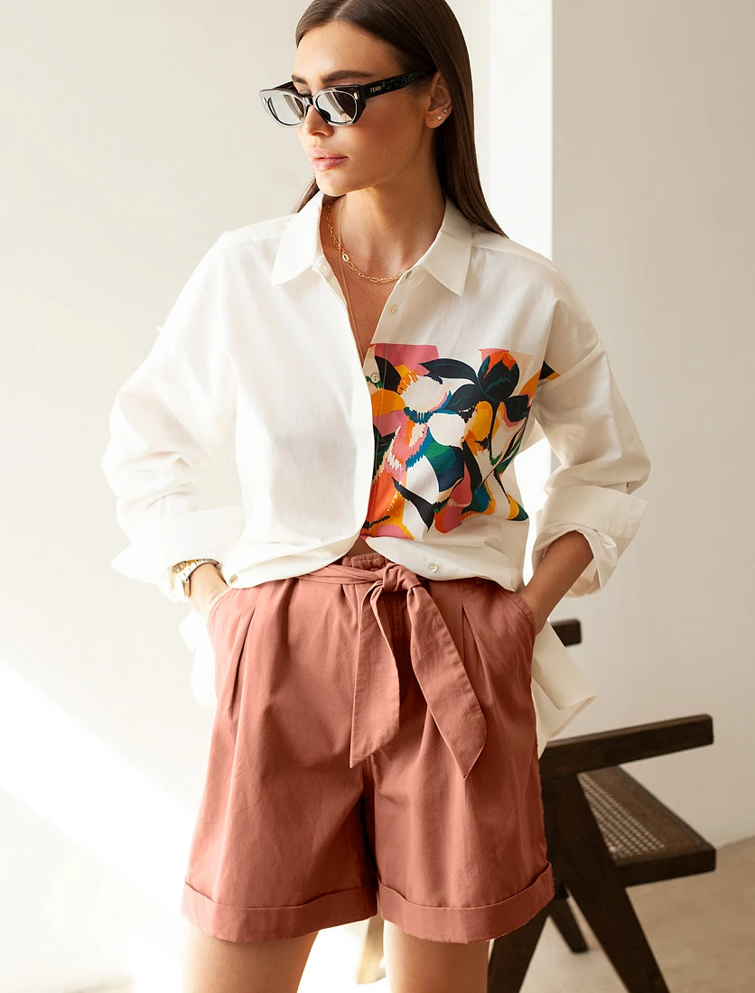Свободние шорты "бермуды" из 100% хлопкового твила. В комплект идет пояс из того же полотна, без пряжки. Стиль сафари поддерживают, подвороты и защипы на высокой талии. Совет стилиста: собрать модный образ в стиле сафари поможет хлопковый жакет D21.067 или свободная блузка поверх топа.