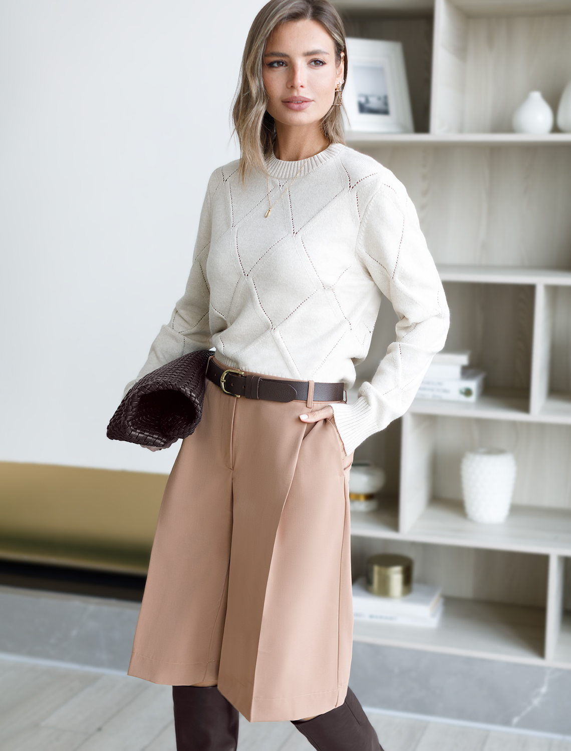 Шорты-бермуды выполнены из эластичной поливискозы. Свободная модель подходит для любой фигуры, скрывает недостатки и подчеркивает достоинства. Универсальные и трендовые шорты, которые хорошо сочетаются с любым верхом в гардеробе. Как деловой и преппи-стиль с лоферами, высокими сапогами, жилетом и водолазкой. С вязаным джемпером и кардиганом с блузкой, можно составить множество комплектов.