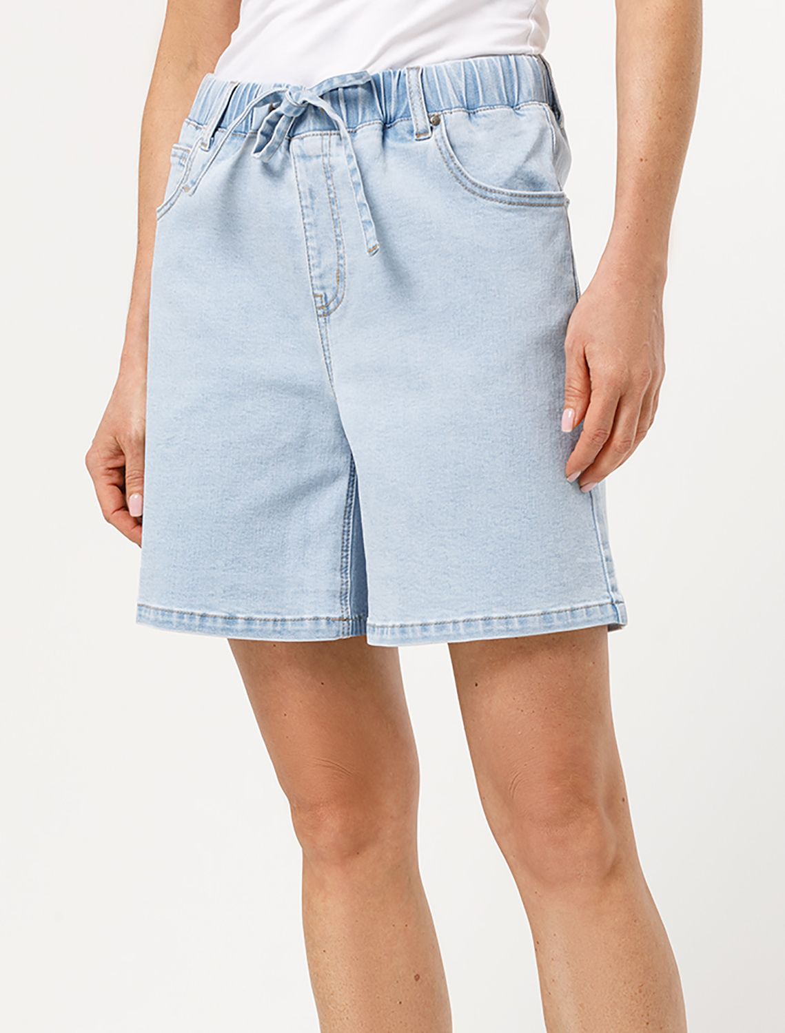 Шорты с легкой декоративной стиркой выполнены из эластичного денима. Модель с ложным гульфиком и поясом из эластичной резинки со шнурком из основного полотна. За счет эластана изделие хорошо тянется и гарантирует комфорт и формоустойчивость. Подходит для любой фигуры.