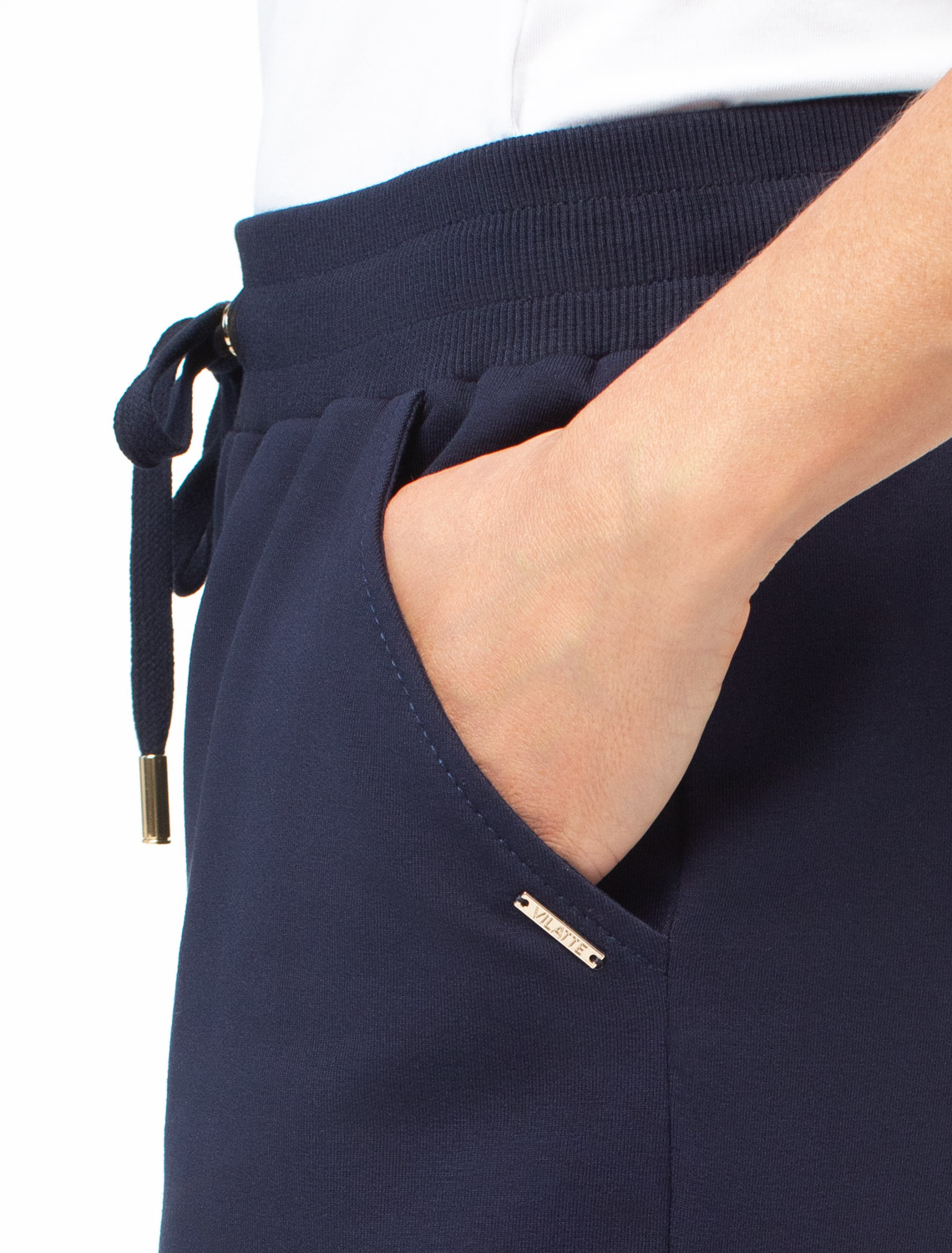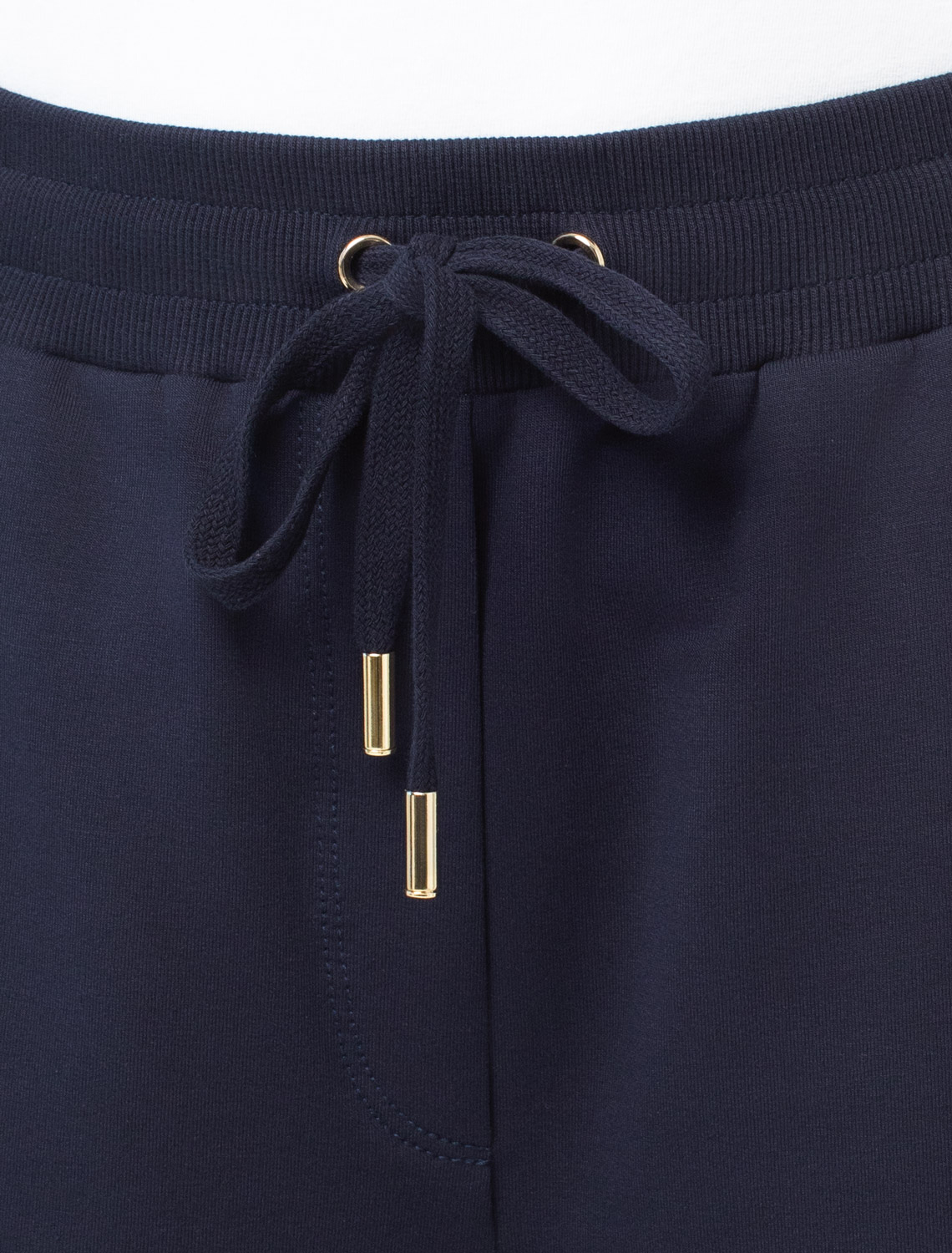 Шорты выполнены из футера двухнитки с эластаном. Модель прямого кроя дополнена боковыми карманами и одним задним карманом. Пояс выполнен из эластичного трикотажа в рубчик. В пояс вставлен плоский хлопковый шнур в тон изделия с золотистыми наконечниками. Изделие дополнено металлическим логотипом бренда. Сочетается в костюме с жакетом D49.078, джемпером D49.079, D49.080 и футболкой D49.081