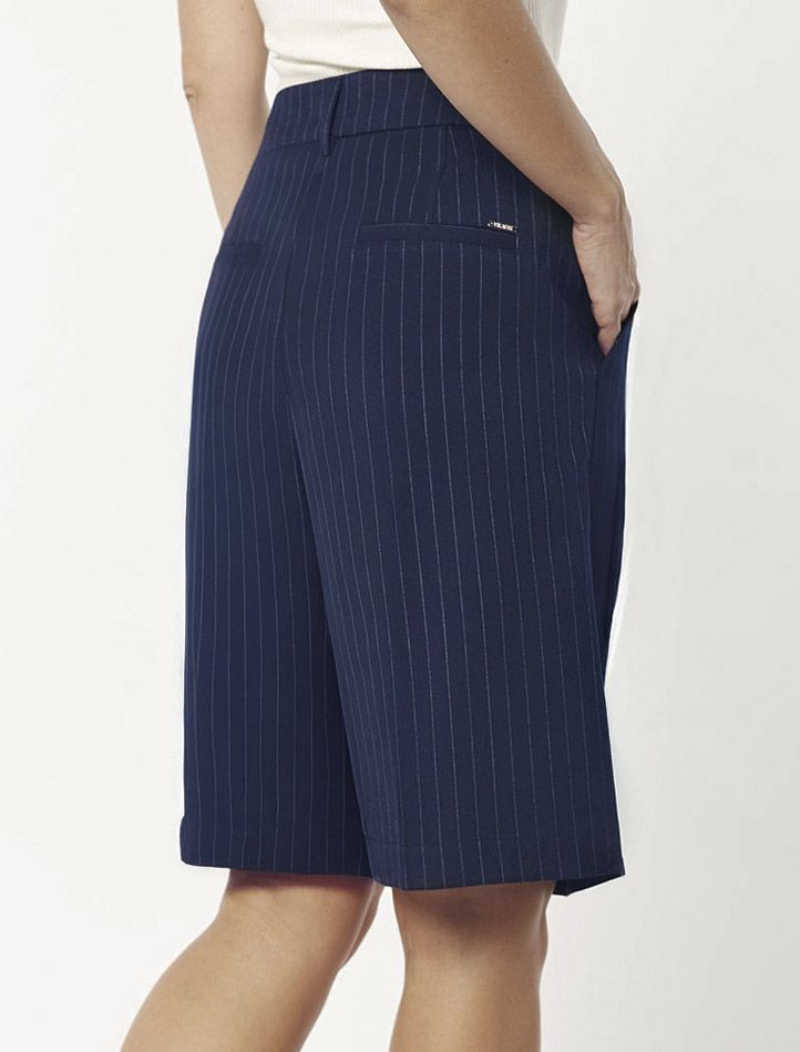 Шорты-бермуды выполнены из костюмной ткани в полоску. Модель свободного кроя дополнена боковыми и задними карманами. Изделие не сковывает движений и подходит для любого типа фигуры. Сочетается в костюме с жилетом D27.001 темно-синий
