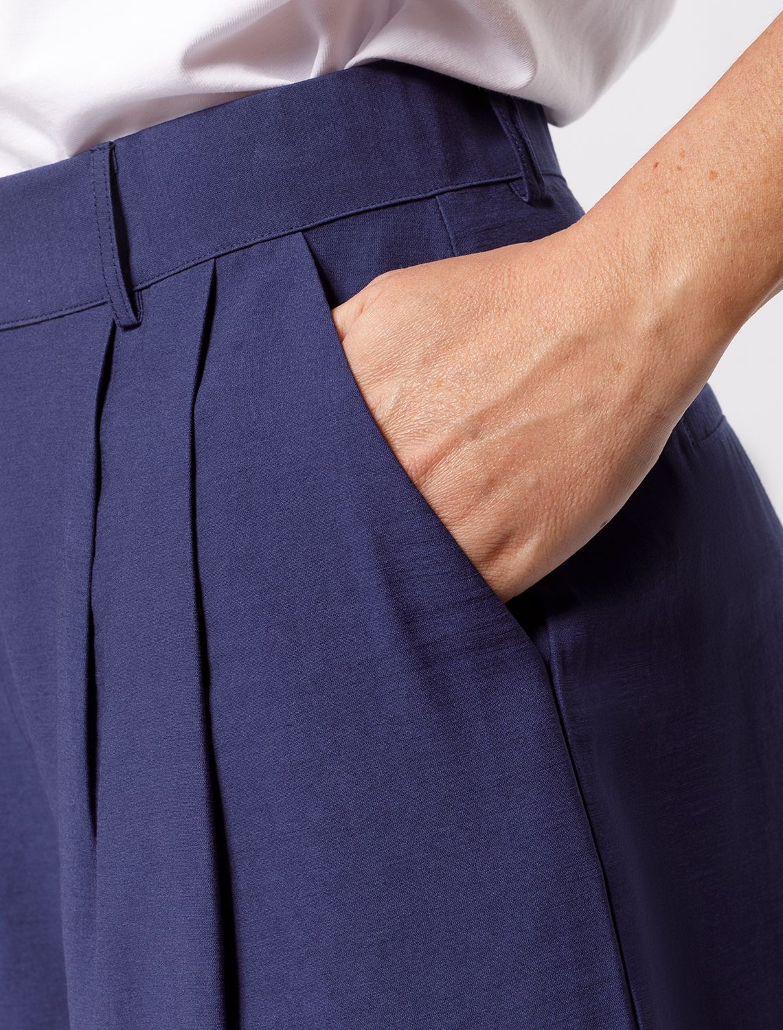Шорты выполнены из плотного лиоцела. Добавление синтетических волокон в составе изделия предотвращает сминаемость. Эластичный пояс на резинке фиксирует изделие не сковывая движений. Есть дополнительные шлевки для ремня. Свободная модель дополнена боковыми карманами и металлическим логотипом бренда. Для создания завершенного образа сочетайте в костюме с топом D23.058, блузкой D28.054, D29.238, D29.239 и D29.240