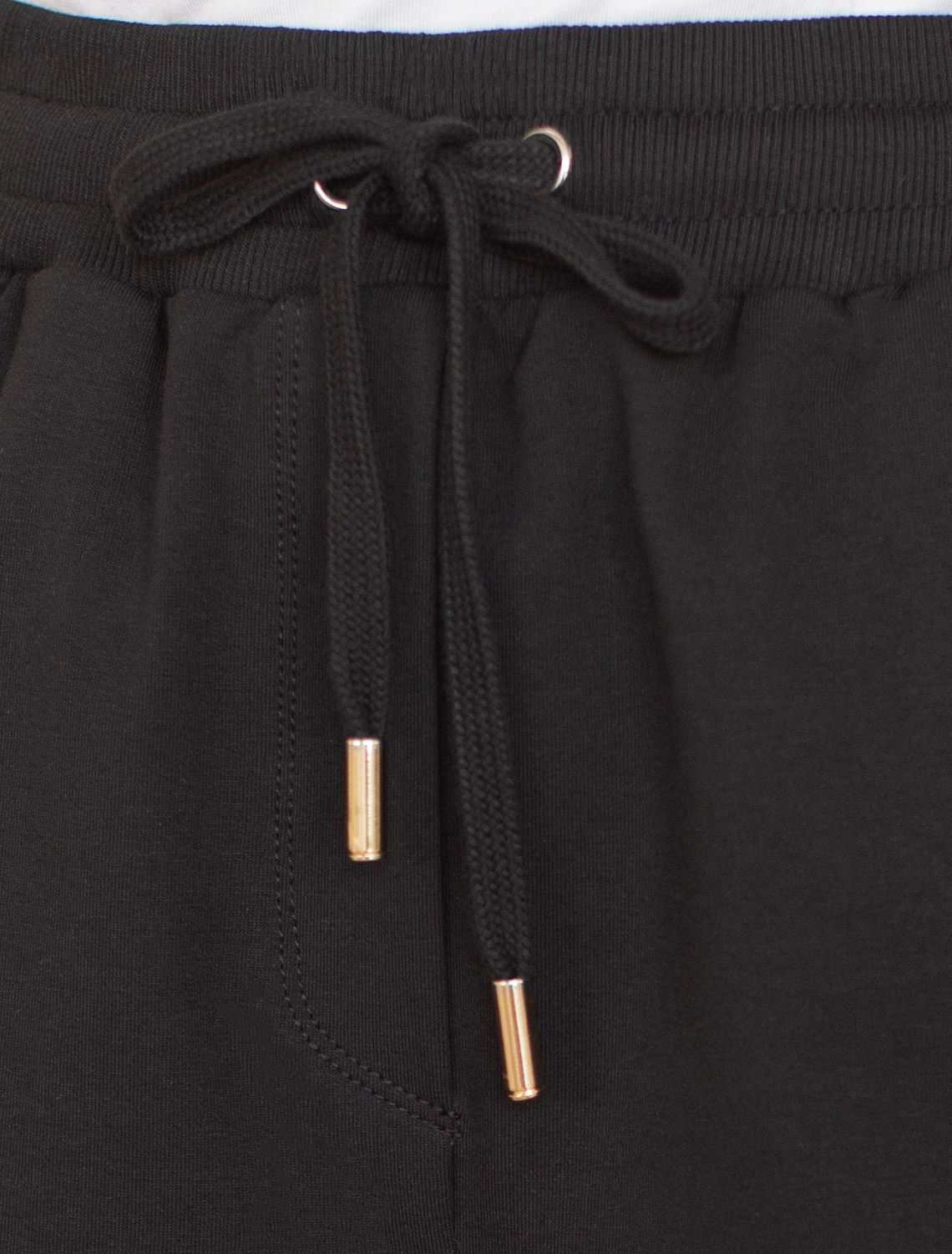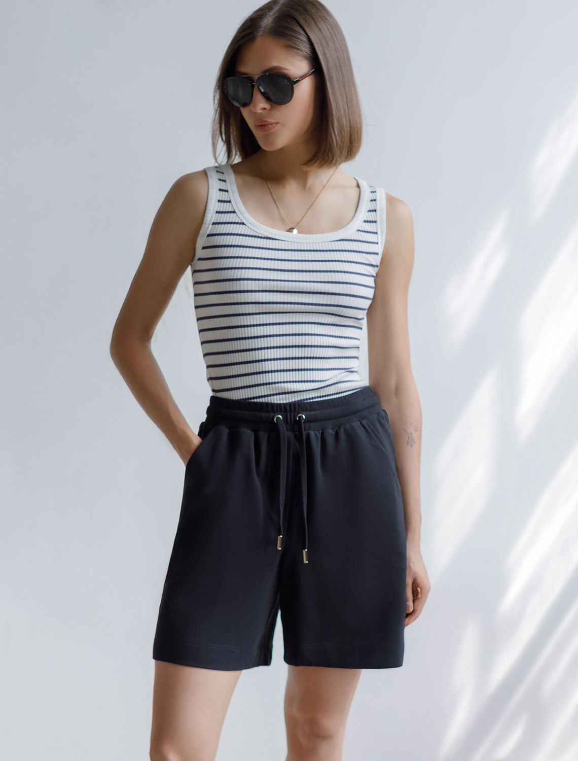 Шорты выполнены из футера двухнитки с эластаном. Модель прямого кроя дополнена боковыми карманами и одним задним карманом. Пояс выполнен из эластичного трикотажа в рубчик. В пояс вставлен плоский хлопковый шнур в тон изделия с серебристыми наконечниками. Изделие дополнено металлическим логотипом бренда. Сочетается в костюме с жакетом D49.078, джемпером D49.079, D49.080 и футболкой D49.081 черный
