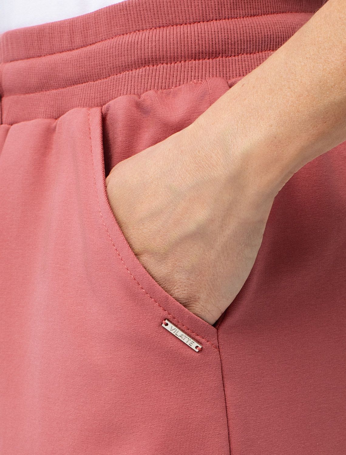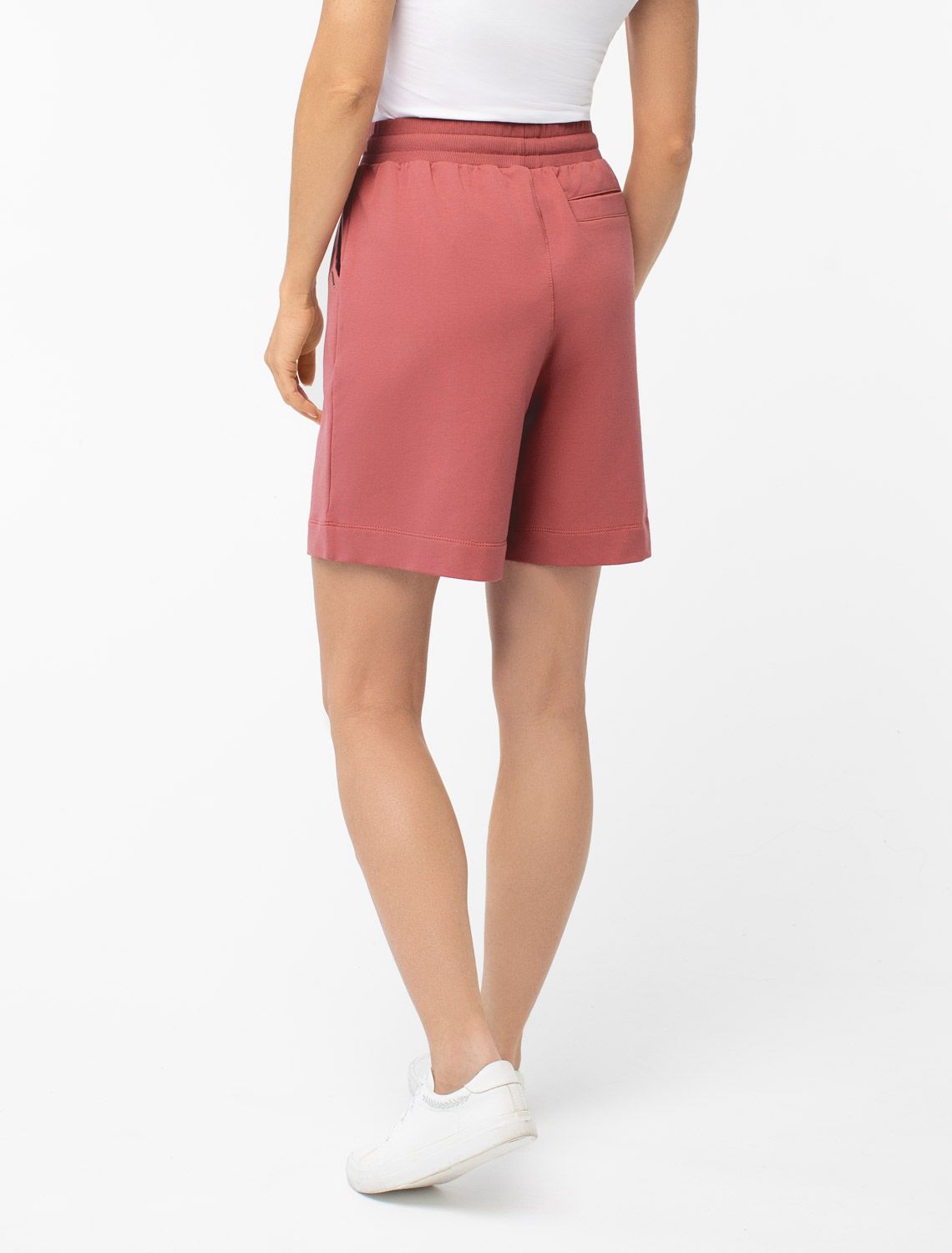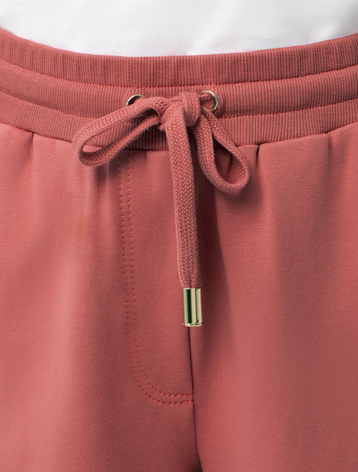 Шорты выполнены из футера двухнитки с эластаном. Модель прямого кроя дополнена боковыми карманами и одним задним карманом. Пояс выполнен из эластичного трикотажа в рубчик. В пояс вставлен плоский хлопковый шнур в тон изделия с золотистыми наконечниками. Изделие дополнено металлическим логотипом бренда. Сочетается в костюме с жакетом D49.078, джемпером D49.079, D49.080 и футболкой D49.081 терракота