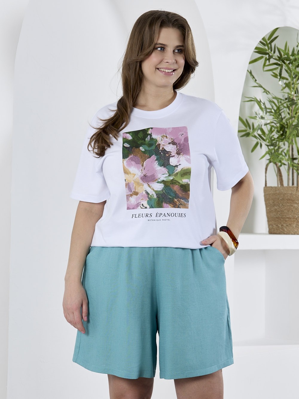 Шорты женские из гладкокрашеного тканого полотна, свободные, длиной до колена, с карманами в боковых швах, на притачном поясе с эластичной тесьмой внутри.