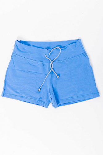 Женские шорты выполнены из футер петли ярких расцветок. Силуэт облегающий, пояс широкий со шнурком. Без карманов.