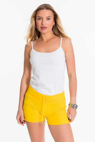 Женские шорты выполнены из футер петли ярких расцветок. Силуэт облегающий, пояс широкий со шнурком. Без карманов.