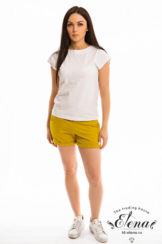 Шорты женские из футер петли с лайкрой. Для лучшей посадки по линии талии продёрнут шнур, а сзади в поясе проложена и зафиксирована эластичная резиновая тесьма. По бокам расположены карманы. Низ шорт оформлен отворотами.