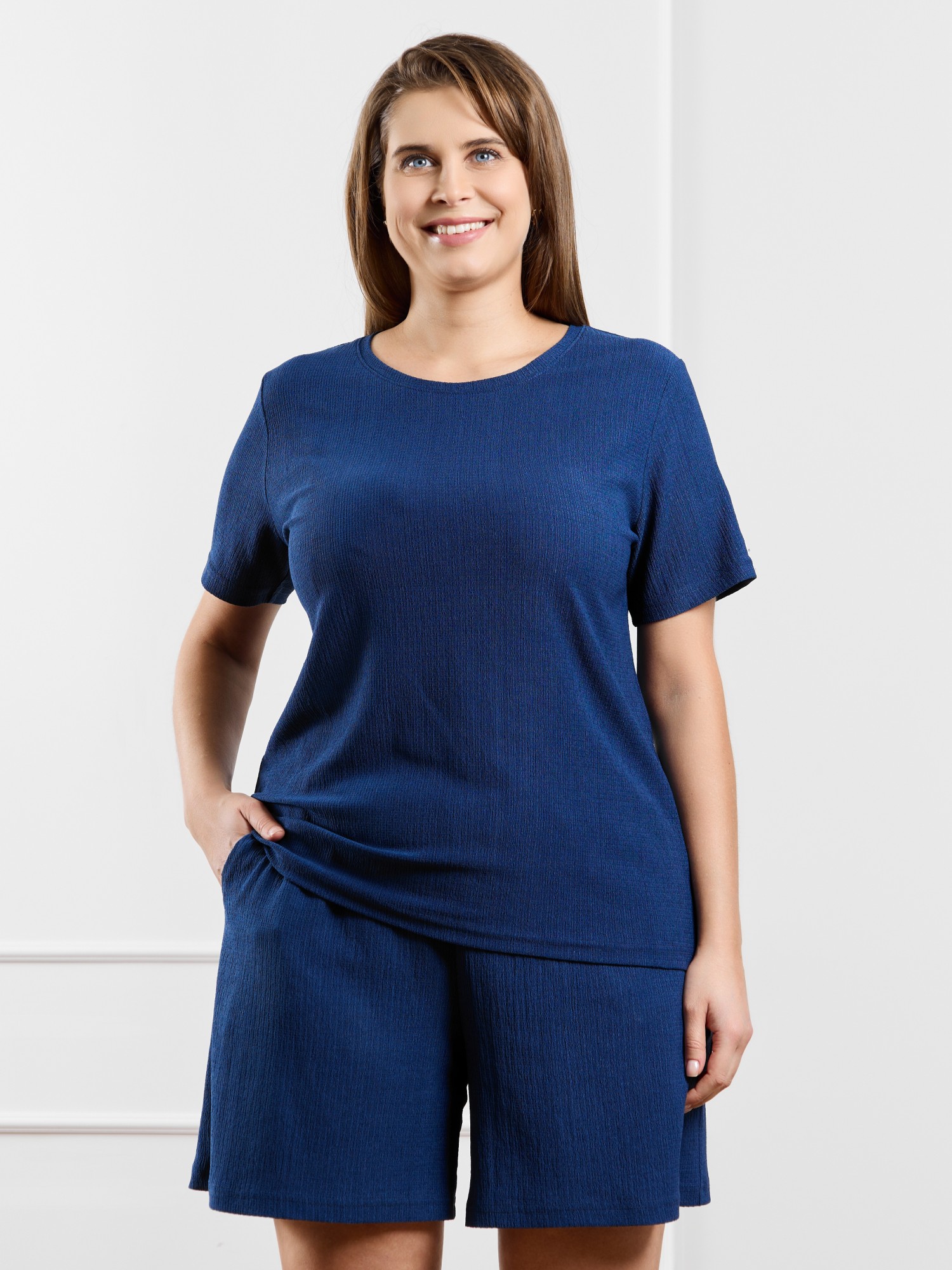 Шорты женские из гладкокрашенного трикотажного полотна «бурумчук», свободные, средней длины, с карманами в боковых швах, на притачном поясе с эластичной тесьмой внутри.