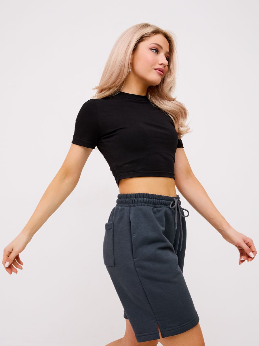 Женские шорты из футера 3-х нитка петля, с отрезным поясом, строчёным с эластичной тесьмой. С лицевой стороны пояса петли, через которые продет шнур. По боковым швам внизу – разрезы. 2 боковых кармана. На правой задней половинке шорт – накладной карман. Низ шорт подшит на плоскошовной машине.