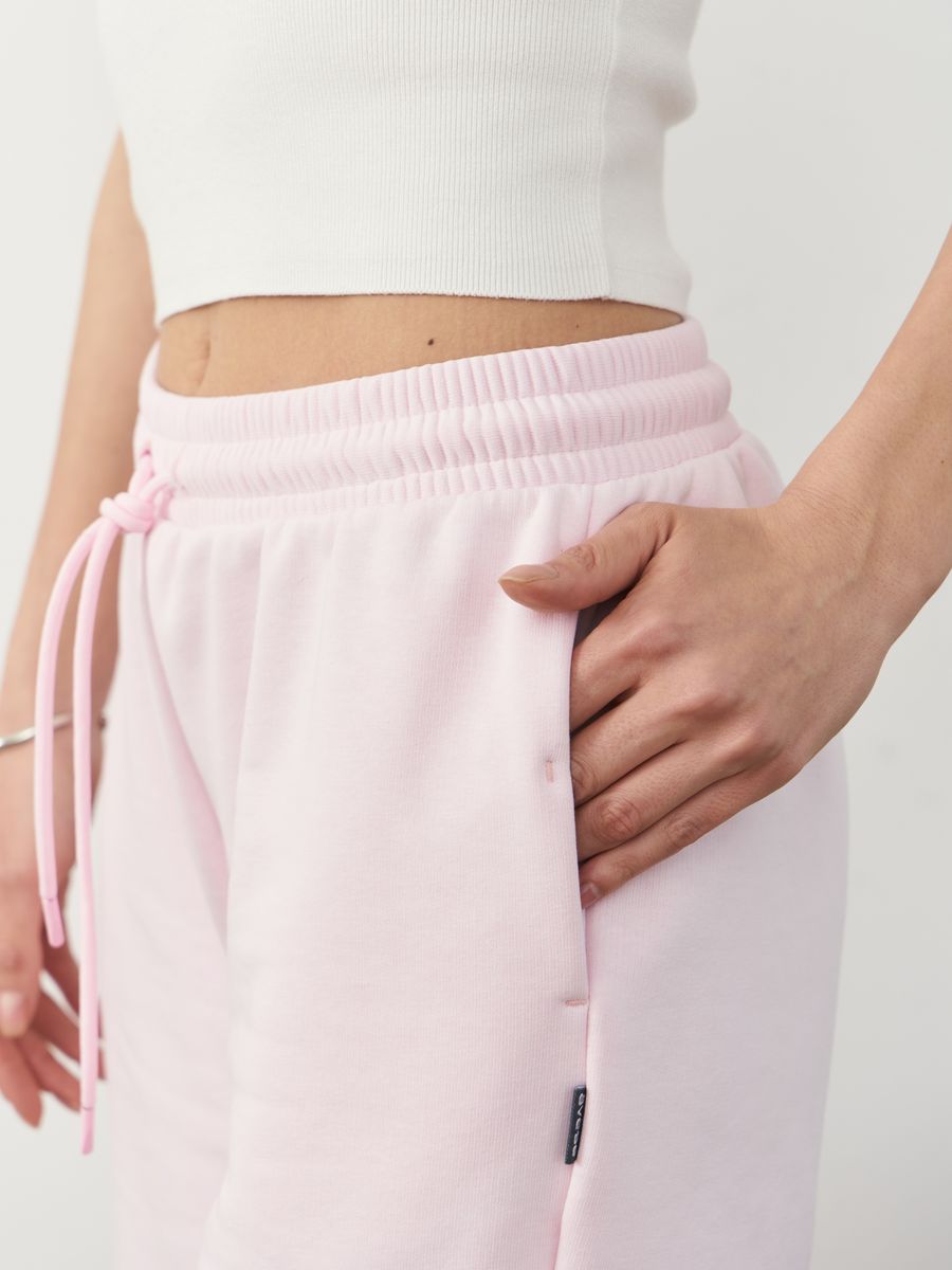 Женские шорты из футера 3-х нитка петля, с отрезным поясом, строчёным с эластичной тесьмой. С лицевой стороны пояса петли, через которые продет шнур. По боковым швам внизу – разрезы. 2 боковых кармана. На правой задней половинке шорт – накладной карман. Низ шорт подшит на плоскошовной машине.