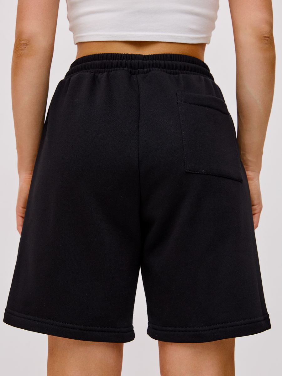 Женские шорты из футера 3-х нитка петля, с отрезным поясом, строчёным с эластичной тесьмой. С лицевой стороны пояса петли, через которые продет шнур. По боковым швам внизу – разрезы. 2 боковых кармана. На правой задней половинке шорт – накладной карман. Низ шорт подшит на плоскошовной машине.