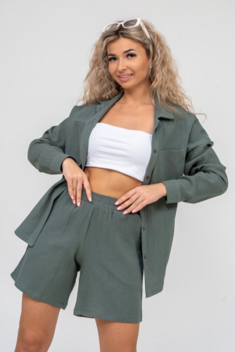 Ткань: муслин; Состав: 100% хлопок; Сезонность: весна, лето; Стиль: молодежный, пляжный, повседневный; Застежка: без застежки; Карман: с карманами; Производство: г. Иваново, швейное производство НАТАЛИ; Тип изделия: шорты; Цвет: зеленый; Длина: средняя длина