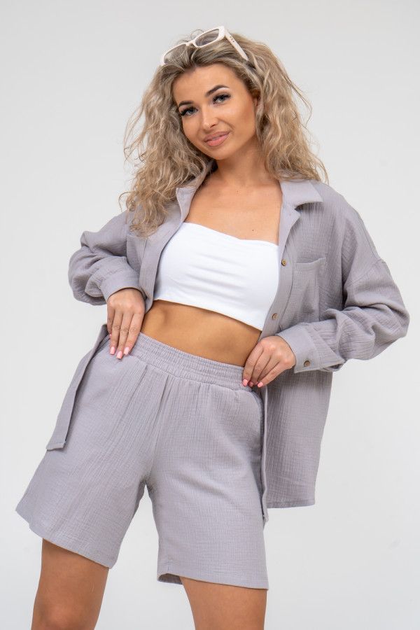 Ткань: муслин; Состав: 100% хлопок; Сезонность: весна, лето; Стиль: молодежный, пляжный, повседневный; Застежка: без застежки; Карман: с карманами; Производство: г. Иваново, швейное производство НАТАЛИ; Тип изделия: шорты; Цвет: серый; Длина: средняя длина