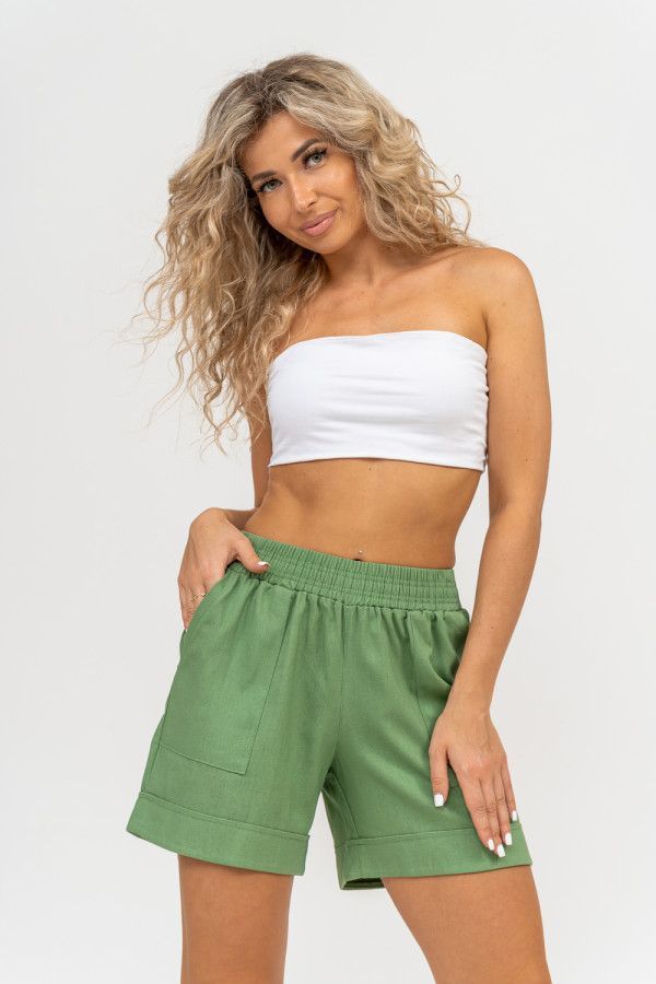 Ткань: лен; Состав: 80% п/э, 20% лен; Сезонность: весна, лето; Стиль: пляжный, повседневный; Застежка: без застежки; Карман: с карманами; Производство: г. Иваново, швейное производство НАТАЛИ; Тип изделия: шорты; Цвет: зеленый; Длина: короткий
